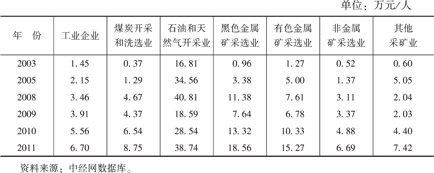 由于工業(yè)經(jīng)濟統(tǒng)計年鑒的數(shù)據(jù)滯后,并且近年不再公布工業(yè)增加值,本文沒有直接利用統(tǒng)計年鑒的勞動生產(chǎn)率數(shù)據(jù),而是采用利潤總額除以從業(yè)人員年平均人數(shù)來衡量勞動生產(chǎn)率。表7顯示,近年來中國采掘業(yè)企業(yè)的勞動生產(chǎn)率有明顯的提高,2011年的數(shù)值與2003年相比,石油和天然氣開采業(yè)提高了1.3倍,煤炭開采和洗選業(yè)、黑色金屬礦采選業(yè)分別提高了22倍和18倍,其他子行業(yè)提高了11倍左右,全部工業(yè)企業(yè)平均提高了3.6倍。采掘業(yè)的勞動生產(chǎn)率提高速度明顯快于其他行業(yè)均值。2003年除石油和天然氣開采業(yè)外,采掘業(yè)各子行業(yè)的勞動生產(chǎn)率都低于工業(yè)企業(yè)平均水平,而在2011年,除金屬礦采選業(yè)外,各子行業(yè)的勞動生產(chǎn)率都高于工業(yè)企業(yè)平均水平。