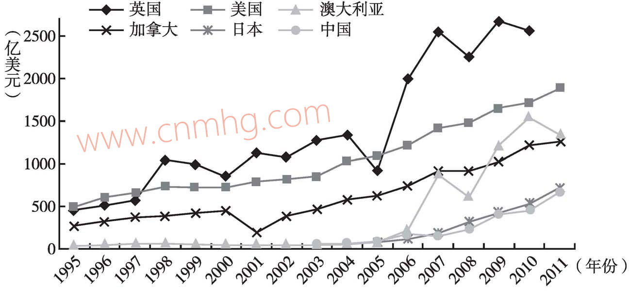 礦產(chǎn)資源是采礦行業(yè)的利潤來源。由于國內(nèi)的礦產(chǎn)資源有限,采礦企業(yè)要在海外開拓礦產(chǎn)資源。采掘業(yè)是中國對外投資的第二大行業(yè),僅次于商務(wù)服務(wù)業(yè),占對外投資額的15%左右。2011年中國非金融類跨國公司按年末對外直接投資存量排序,礦產(chǎn)行業(yè)的中石化、中石油、中海油位列前3名,五礦集團、中國鋁業(yè)、中化集團分別位列第7、9、10名??梢姾M馔顿Y對采礦企業(yè)的重要性。近年來比較典型的案例有中金嶺南聯(lián)合印度尼西亞的安塔公司收購澳大利亞先驅(qū)公司,中國鋁業(yè)聯(lián)合美國鋁業(yè)收購澳大利亞力拓集團的部分股份,中國五礦集團收購世界第二大鋅礦開采商澳大利亞OZMineral,中國海洋石油有限公司收購加拿大尼克森公司。根據(jù)商務(wù)部的數(shù)據(jù),近年來中國采掘業(yè)對外直接投資流量整體呈現(xiàn)上漲趨勢(見圖6),但波動較大,2006、2009、2011年較高,是臨近年份的2倍。非金融類對外直接投資年流量近年來快速增長,2011年流量為685.8億美元,比2003年增長23倍,而同期采掘業(yè)對外直接投資僅增長了9倍,使得采掘業(yè)對外直接投資占非金融類的比例下降,從2003年的48%下降到2011年的21%。這顯示了中國對外投資結(jié)構(gòu)的變化,企業(yè)將資金投入到采掘業(yè)以外的行業(yè)。根據(jù)商務(wù)部的數(shù)據(jù),中國采掘業(yè)對外直接投資2011年末的存量為670億美元,位于世界前列,與日本相當(dāng),是美國的1/3。對外直接投資存量最大的國家是英國、美國、澳大利亞、加拿大,這些都是世界上礦產(chǎn)資源豐富的國家。與2004年末的存量相比,中國采掘業(yè)對外直接投資存量在7年間增長了10倍,而澳大利亞同期增長了25倍,是增長速度最快的國家。美國、加拿大分別增長了83%、118%,由于這些國家的存量基數(shù)大,雖然增長速度不高,但增量相當(dāng)大??梢?,各國都努力搶占海外資源,采掘業(yè)的競爭變?yōu)橘Y源控制權(quán)的競爭。