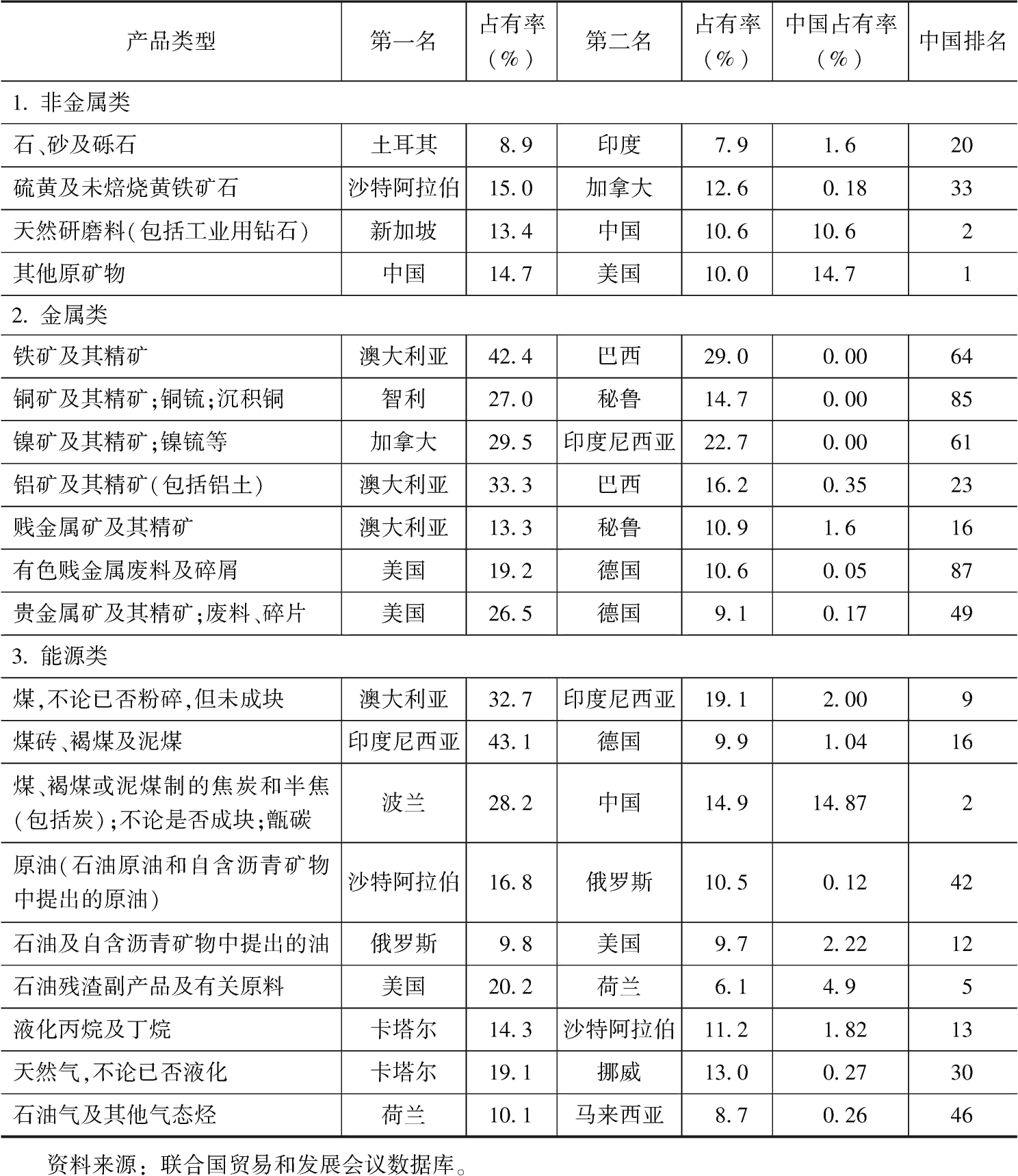 表5 采掘業(yè)產(chǎn)品的2011年國際市場占有率比較