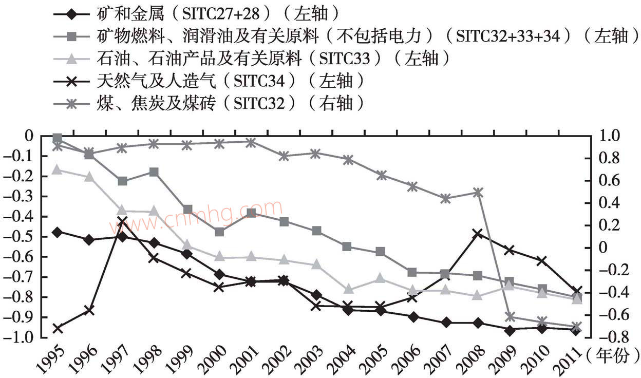 中國采掘業(yè)產(chǎn)品的進(jìn)出口貿(mào)易都是進(jìn)口超過出口,貿(mào)易競爭力自1995年以來都是負(fù)值,而且逐年快速下降,2011年幾乎降至全部進(jìn)口的水平。礦和金屬類產(chǎn)品(SITC27+28)的貿(mào)易競爭力從1995年的-47%下降到2011年的-96%,礦物燃料、潤滑油及有關(guān)原料(不包括電力)(SITC32+33+34)的貿(mào)易競爭力從-1%下降到-80%(見圖1)。