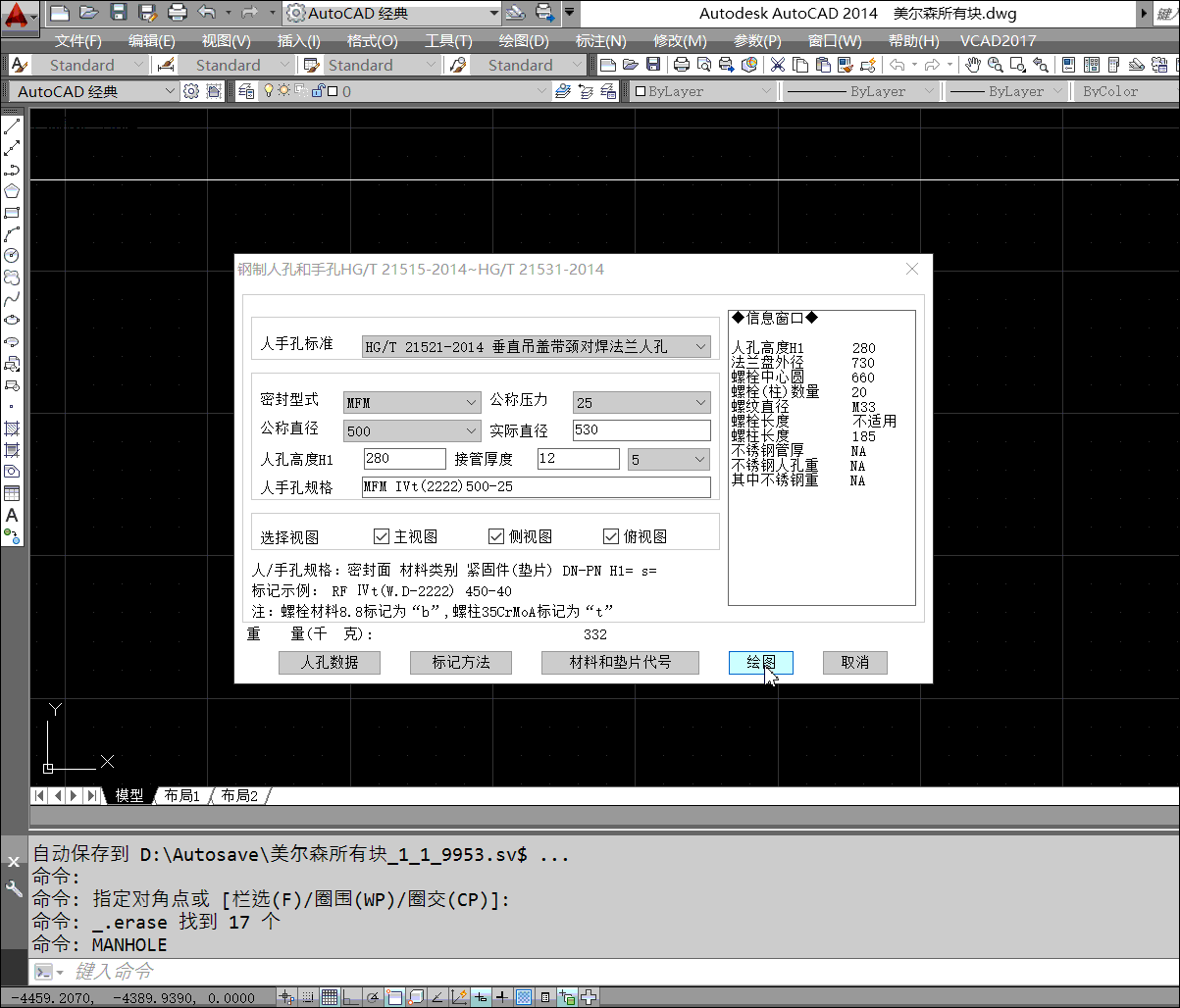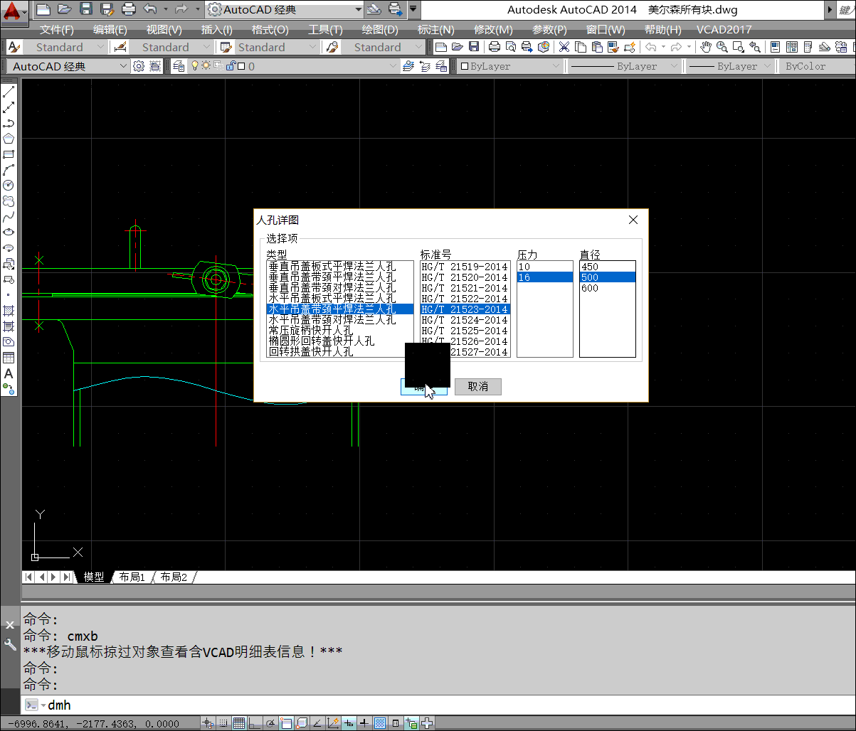 為了順利繪制人孔,VCAD將HG/T 21515-2014~HG/T 21531-2014的簡圖三視圖全部繪制,并用程序調(diào)用出來,方便使用。