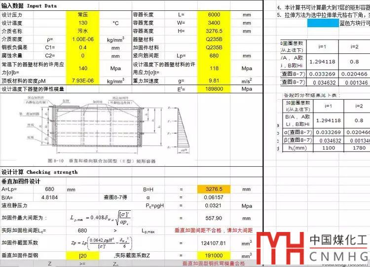 常壓矩形容器可以依據(jù)NB/T47003.1-2009 第8節(jié)和標(biāo)準(zhǔn)附錄的算例進(jìn)行設(shè)計(jì),如果尺寸較大,一般采用垂直和橫向聯(lián)合加固型(E 型)結(jié)構(gòu)。E型的計(jì)算步驟一般如下: