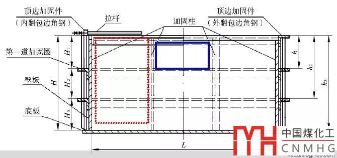 2. 頂邊加固件設(shè)計(jì)。頂邊加固件型式:平頂/拉桿/敞口。若為平頂或拉桿型式,則Hc=總高,Lc=Lp,若為敞口型式,則由于中間的垂直加固件無(wú)支撐,所以不能起加強(qiáng)作用,Lc只能取總長(zhǎng)。計(jì)算的內(nèi)容:頂板加固件所需要的慣性矩。