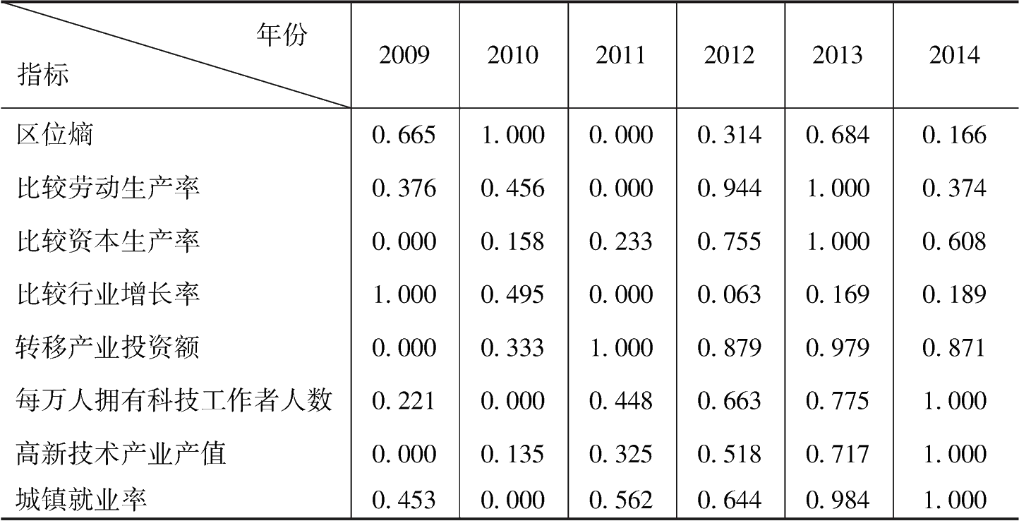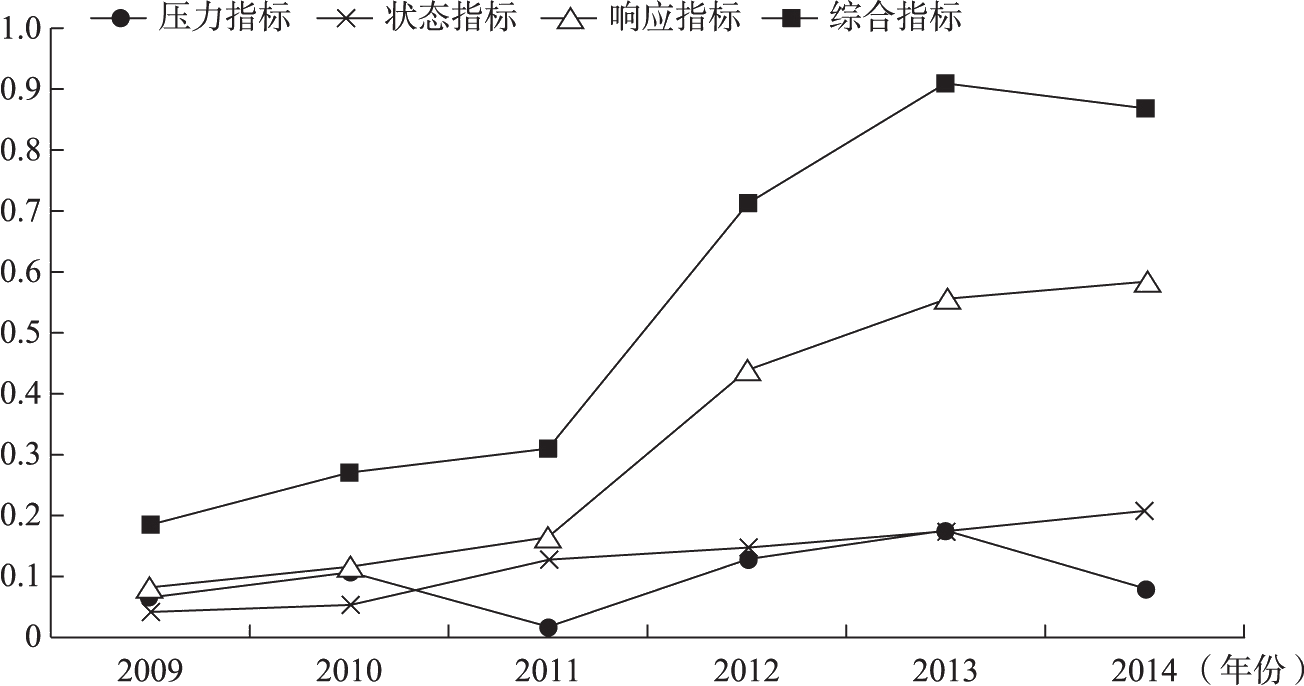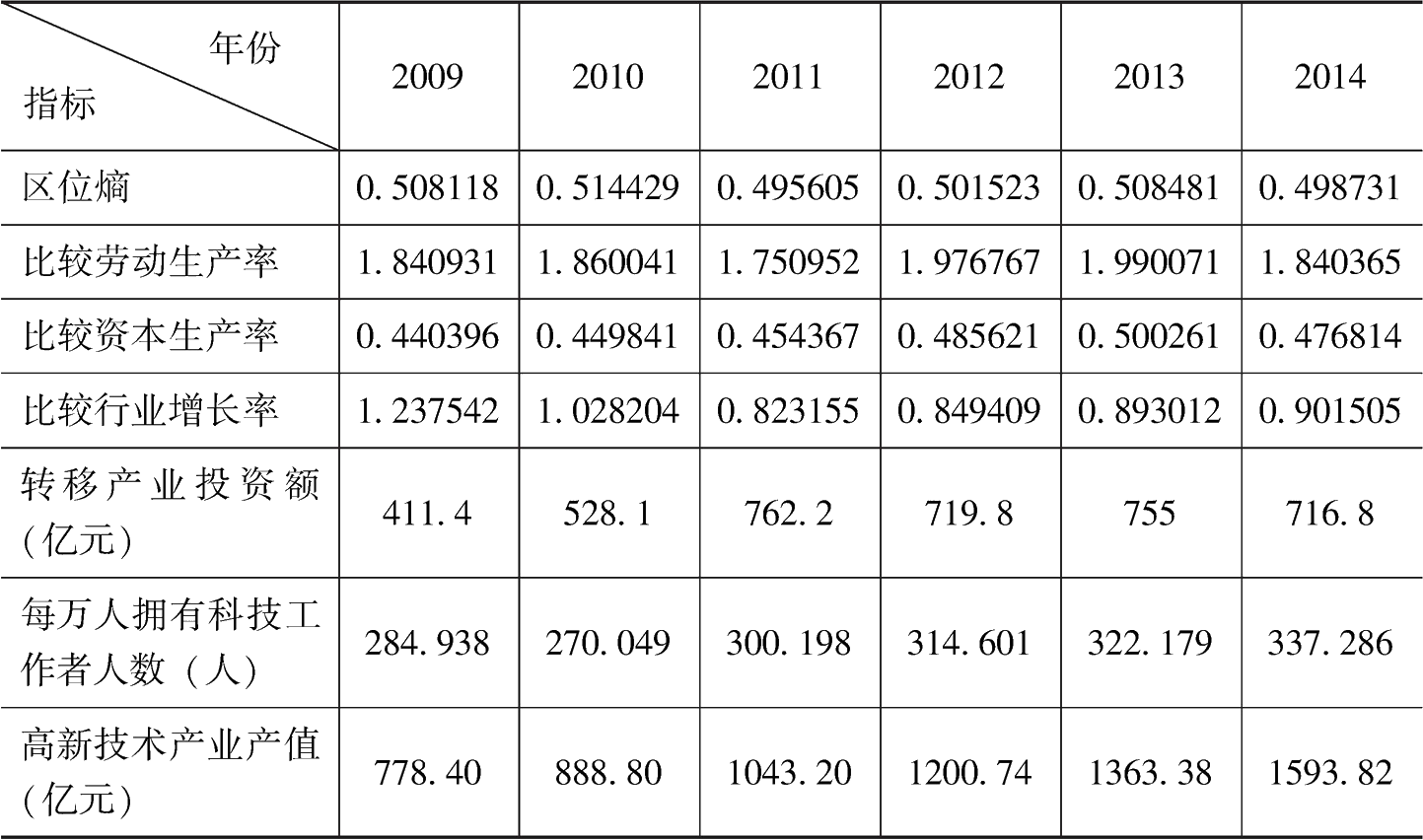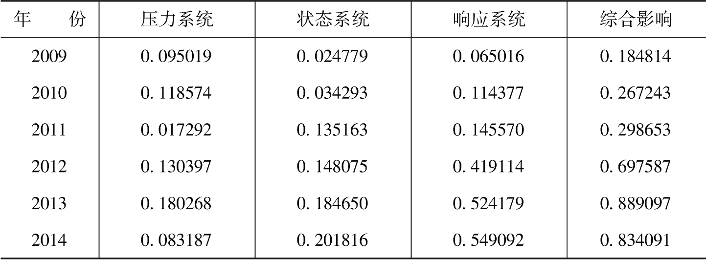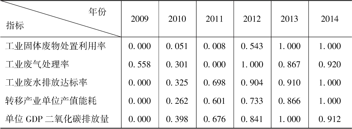 由表8-6可以看出,2009~2011年的綜合評(píng)價(jià)得分分別為0.184814、0.267243、0.298653,產(chǎn)業(yè)轉(zhuǎn)移綜合影響評(píng)價(jià)為差,壓力系統(tǒng)和狀態(tài)系統(tǒng)的得分相較于響應(yīng)系統(tǒng)很高,說明這一階段的產(chǎn)業(yè)轉(zhuǎn)移還是以經(jīng)濟(jì)效益為重,相關(guān)環(huán)境指標(biāo)的表現(xiàn)不盡如人意,產(chǎn)業(yè)轉(zhuǎn)移的效果較差。2012年和2013年的綜合評(píng)價(jià)得分分別為0.697587和0.889097,分值得到了極大的提升,產(chǎn)業(yè)轉(zhuǎn)移影響評(píng)價(jià)結(jié)果分別為“好”和“很好”,具體來看,壓力系統(tǒng)與狀態(tài)系統(tǒng)變化不大,但響應(yīng)系統(tǒng)的得分有了明顯的上升趨勢。在綜合指標(biāo)中,響應(yīng)系統(tǒng)中的環(huán)境因素影響占了很大的比重,近幾年對(duì)環(huán)境問題的重視,不再以經(jīng)濟(jì)利益為前提,突出了生態(tài)環(huán)境的重要性。2014年的綜合評(píng)價(jià)得分為0.834091,低于2013年的0.889097,但是深入分析,減少的是壓力指標(biāo),而狀態(tài)指標(biāo)與響應(yīng)指標(biāo)都有所增加,這說明產(chǎn)業(yè)轉(zhuǎn)移取得了一定的成效,政府減少了投資,一些重污染企業(yè)已經(jīng)完成產(chǎn)業(yè)轉(zhuǎn)移,比如煤炭開采洗選業(yè)、黑色金屬采選業(yè)、黑色金屬冶煉及壓延加工業(yè)、非金屬礦物制品業(yè)等工業(yè)產(chǎn)值都出現(xiàn)了負(fù)增長。對(duì)環(huán)境問題的重視、高能耗重污染企業(yè)的轉(zhuǎn)移、“三廢”處理力度的加大,極大地改善了生態(tài)環(huán)境,這表現(xiàn)為轉(zhuǎn)出地環(huán)境壓力的減小,以及相關(guān)環(huán)境指標(biāo)的提升。