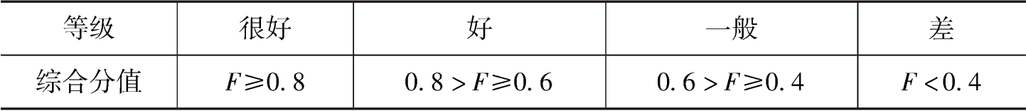 制定相關(guān)的指標(biāo)評(píng)價(jià)標(biāo)準(zhǔn)一方面可以使其具有一定的層次性,方便對(duì)指標(biāo)進(jìn)行歸類劃分,進(jìn)一步研究其內(nèi)在的不同特性,另一方面使評(píng)價(jià)結(jié)果更為直觀,更容易被大多數(shù)人接受,更具有現(xiàn)實(shí)指導(dǎo)意義。根據(jù)本書的研究實(shí)際,我們采用等級(jí)判斷法設(shè)定評(píng)價(jià)的相關(guān)標(biāo)準(zhǔn),將指標(biāo)得分區(qū)間劃分為四個(gè)層次,如表8-2所示。