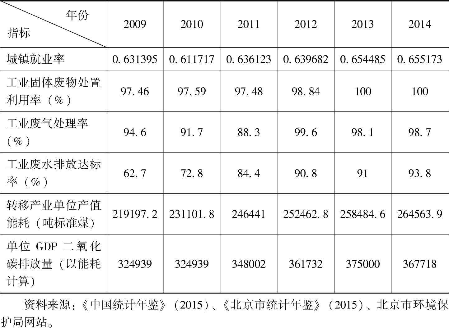 根據(jù)上文選取的相關(guān)指標(biāo),從《中國統(tǒng)計(jì)年鑒》《北京市統(tǒng)計(jì)年鑒》以及北京市環(huán)境保護(hù)局網(wǎng)站獲取相關(guān)原始數(shù)據(jù),再根據(jù)各個(gè)指標(biāo)的具體含義和計(jì)算方法計(jì)算出具體的指標(biāo)值,如表8-3所示。