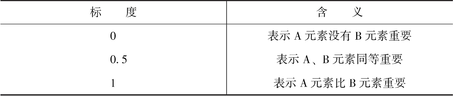 層次分析法是將一個(gè)復(fù)雜的問題分解為多個(gè)目標(biāo)與準(zhǔn)則,再基于相關(guān)理論將這些目標(biāo)與準(zhǔn)則按照層次關(guān)系組成不同的層次結(jié)構(gòu),進(jìn)而形成多指標(biāo)的若干層次,最后通過整體比較或兩兩比較方式計(jì)算得到相關(guān)指標(biāo)的重要程度。這種方法需要專家在各指標(biāo)之間進(jìn)行選擇,做出主觀判斷,因此得出的指標(biāo)權(quán)重主觀性很強(qiáng)。此外采取整體比較法時(shí),其通常構(gòu)建的判斷矩陣采用的指標(biāo)評(píng)分為從1到9,專家在做主觀判斷時(shí)容易出現(xiàn)不一致性,需要再進(jìn)行一致性檢驗(yàn)。本書對(duì)傳統(tǒng)的層次分析法進(jìn)行改進(jìn),引入模糊一致性矩陣,使用模糊層次分析法對(duì)權(quán)重進(jìn)行計(jì)算,該方法采用兩兩比較的方式,建立0—1標(biāo)度的判斷矩陣,這樣一方面縮小指標(biāo)的對(duì)比范圍,省略一致性檢驗(yàn)的步驟,另一方面最后得出的決策模型也更加簡單、通俗易懂,為政策的制定提供借鑒。