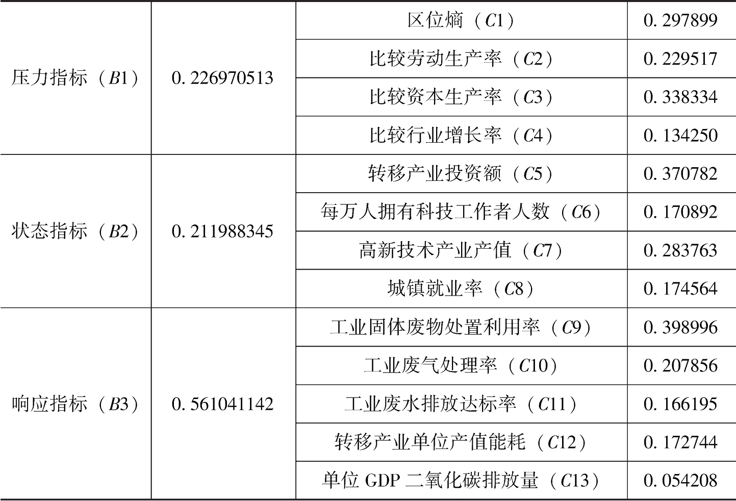 由表8-5可以看到,壓力指標(biāo)、狀態(tài)指標(biāo)和響應(yīng)指標(biāo)三個(gè)一級(jí)指標(biāo)相對(duì)于整個(gè)評(píng)價(jià)系統(tǒng)的權(quán)重分別為0.227、0.212和0.56,可以看出響應(yīng)系統(tǒng)的指標(biāo)所占權(quán)重較大,大于前兩個(gè)指標(biāo)權(quán)重之和,這是因?yàn)槲覀儗?duì)京津冀經(jīng)濟(jì)圈產(chǎn)業(yè)轉(zhuǎn)移影響的評(píng)價(jià)是基于產(chǎn)業(yè)安全角度考慮的。本書將產(chǎn)業(yè)安全中的生態(tài)安全作為對(duì)京津冀經(jīng)濟(jì)圈產(chǎn)業(yè)轉(zhuǎn)移影響評(píng)價(jià)的重中之重,這與近年來北京地區(qū)環(huán)境污染問題日益嚴(yán)重的現(xiàn)狀與國家下決心對(duì)其進(jìn)行治理的力度分不開。同時(shí)我們也不能忽視產(chǎn)業(yè)轉(zhuǎn)移對(duì)社會(huì)經(jīng)濟(jì)的影響,所以分別將壓力指標(biāo)和狀態(tài)指標(biāo)的權(quán)重值設(shè)為0.227和0.212。