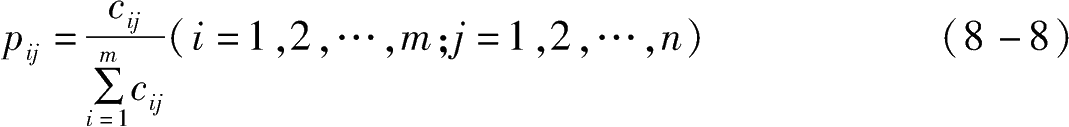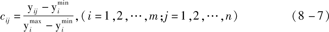 利用無量綱化方法處理以上原始數(shù)據(jù),利用公式(8-7)對(duì)其進(jìn)行標(biāo)準(zhǔn)化,得到各指標(biāo)標(biāo)準(zhǔn)化值,如表8-4所示。