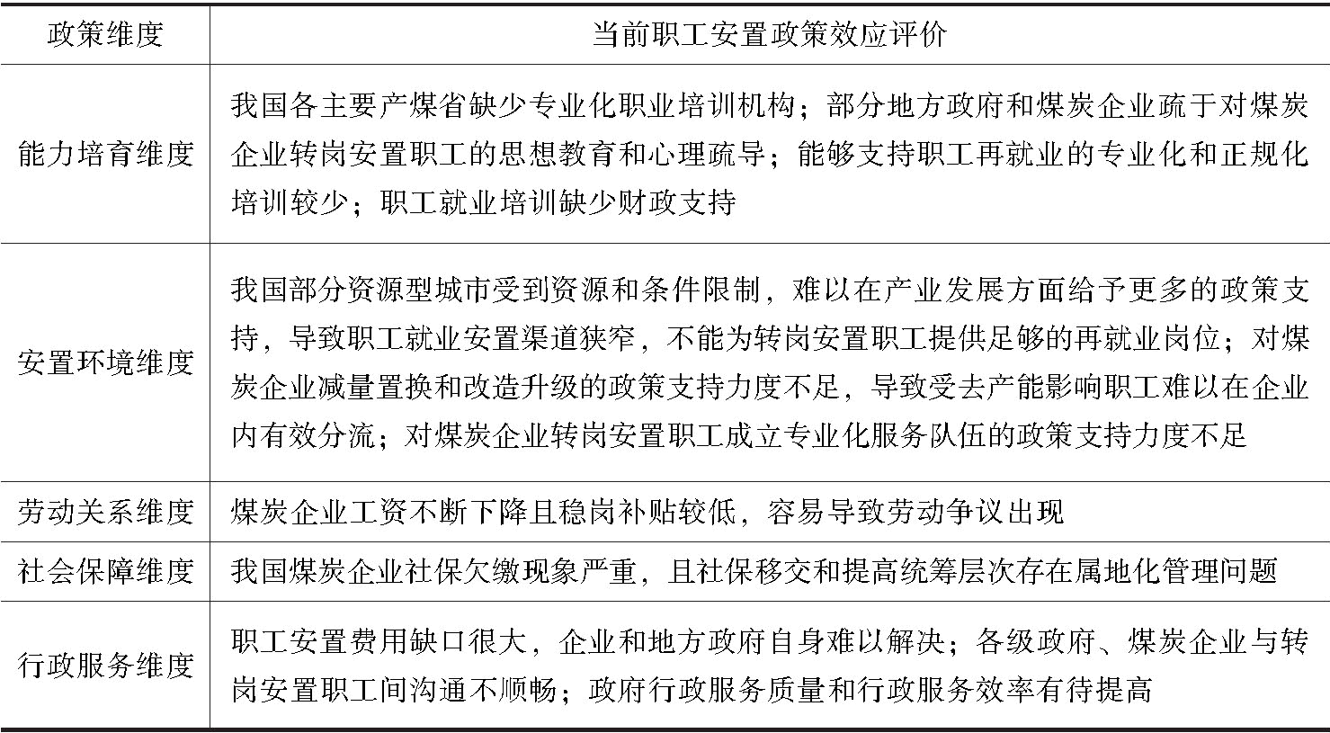 通過(guò)對(duì)我國(guó)煤炭行業(yè)就業(yè)與職工安置政策的效應(yīng)分析,發(fā)現(xiàn)當(dāng)前煤炭行業(yè)就業(yè)與職工安置政策落實(shí)存在的主要不足如表8-4所示。