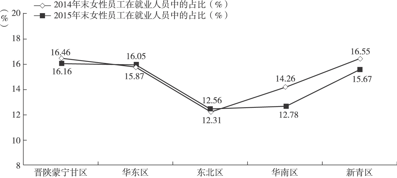 圖8-5 2014~2015年各區(qū)域女性職工在就業(yè)人員中的占比