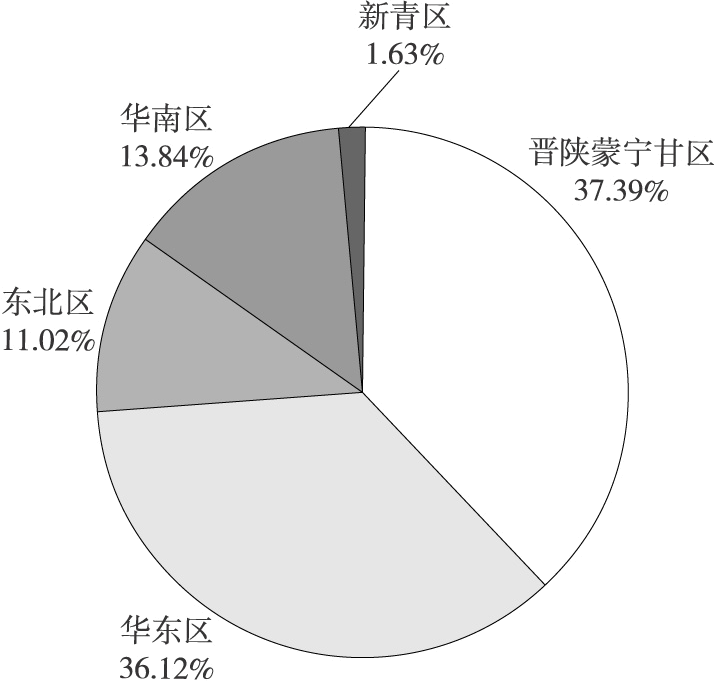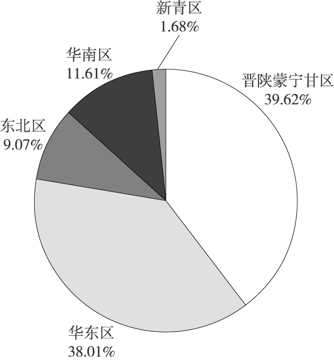 煤炭企業(yè)主要分布在我國(guó)25個(gè)省份,煤炭行業(yè)的人力資源區(qū)域分布特征通常會(huì)受到煤炭資源稟賦和煤礦災(zāi)害特征的限制。因此,本研究按照以下三大原則對(duì)我國(guó)煤炭企業(yè)分布區(qū)域進(jìn)行劃分。一是開(kāi)采地質(zhì)條件相似性原則。通過(guò)對(duì)中國(guó)地質(zhì)構(gòu)造背景及其對(duì)煤田地質(zhì)特征的控制作用分析,找尋區(qū)劃單元的相似性。二是煤礦災(zāi)害基本特征一致性原則。分析、總結(jié)各主要礦區(qū)災(zāi)害發(fā)生起因,找尋其內(nèi)在聯(lián)系,主要煤礦災(zāi)害特征基本一致。三是行政區(qū)劃原則。在綜合開(kāi)采地質(zhì)條件、主體采煤技術(shù)、實(shí)際災(zāi)害狀況、市場(chǎng)供給能力和行政區(qū)劃等因素的基礎(chǔ)上,將全國(guó)劃分成晉陜蒙寧甘區(qū)(山西、陜西、內(nèi)蒙古、寧夏、甘肅)、華東區(qū)(北京、天津、河北、山東、河南、安徽、江蘇、上海、浙江)、東北區(qū)(黑龍江、吉林、遼寧)、新青區(qū)(新疆、青海)和華南區(qū)(上述以外其他省份)5大產(chǎn)煤區(qū)。