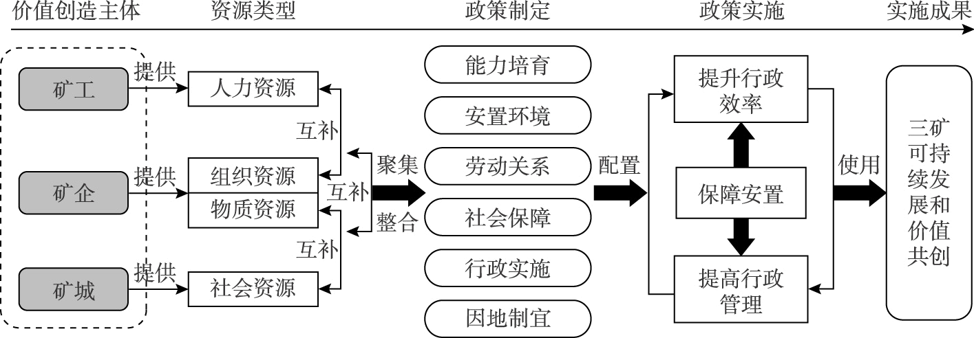 礦城是價(jià)值創(chuàng)造的環(huán)境與載體,礦企是價(jià)值創(chuàng)造的功能單元,礦工是價(jià)值創(chuàng)造的核心元素,三者是互相交織、互相依托的。礦城應(yīng)當(dāng)以創(chuàng)建人民滿(mǎn)意的服務(wù)型政府為根本目標(biāo),采取“三方聯(lián)動(dòng),協(xié)同發(fā)展”的模式,建立礦城、礦企和礦工共同愿景,實(shí)現(xiàn)資源和功能上的優(yōu)勢(shì)互補(bǔ)與高效協(xié)同,通過(guò)三方聯(lián)動(dòng)打造協(xié)同發(fā)展中各主體、各要素和各環(huán)節(jié)的有機(jī)對(duì)接與融合機(jī)制,基于價(jià)值共創(chuàng)理念構(gòu)筑起以職工安置為導(dǎo)向、礦城為引導(dǎo)、礦企為主體、礦工為核心的三方協(xié)同職工安置體系,提升礦城的產(chǎn)業(yè)核心競(jìng)爭(zhēng)力、礦企的轉(zhuǎn)型升級(jí)和可持續(xù)發(fā)展能力以及礦工的技能素質(zhì)和再就業(yè)能力。
