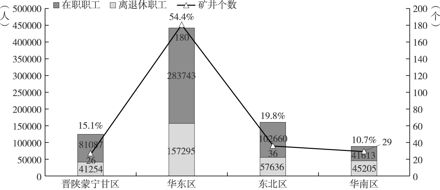 由于本次摸底調(diào)研未涉及新青區(qū)的煤炭企業(yè),所以,本研究按照晉陜蒙寧甘區(qū)、華東區(qū)、東北區(qū)和華南區(qū)四個(gè)區(qū)域?qū)⑹苡绊懧毠し诸?lèi)比較(如圖8-10所示)。晉陜蒙寧甘區(qū)面臨退出煤礦26處,產(chǎn)能5400萬(wàn)噸,涉及職工總數(shù)122341人,占比15.1%,其中,在職職工81087人,離退休職工41254人。華東區(qū)面臨退出煤礦180處,產(chǎn)能13483萬(wàn)噸,涉及職工總數(shù)441038人,占比54.4%,其中,在職職工283743人,離退休職工157295人。東北區(qū)面臨退出煤礦36處,產(chǎn)能4627萬(wàn)噸,涉及職工總數(shù)160296人,占比19.8%,其中,在職職工102660人,離退休職工57636人。華南區(qū)面臨退出煤礦29處,產(chǎn)能1087萬(wàn)噸,涉及職工總數(shù)86818人,占比10.7%,其中,在職職工41613人,離退休職工45205人。