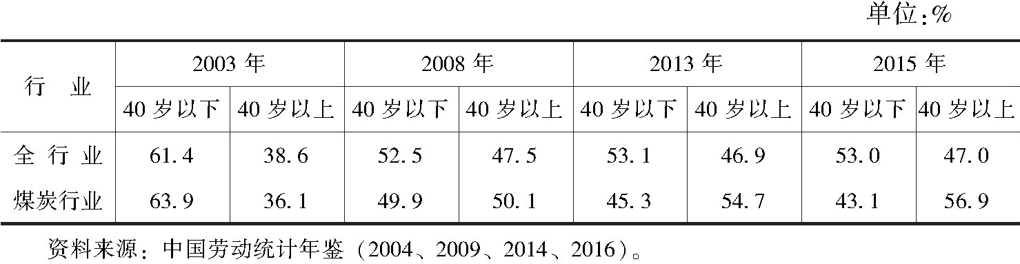 由表8-1,與全國(guó)就業(yè)人員年齡構(gòu)成相比,2003年,我國(guó)煤炭行業(yè)40歲以下的就業(yè)人員占行業(yè)人員總數(shù)的63.9%,高于全國(guó)就業(yè)人員40歲以下的比例。然而,2003年之后,我國(guó)煤炭行業(yè)40歲以下就業(yè)人員的比例低于全行業(yè)40歲以下的比例,且煤炭行業(yè)40歲以下就業(yè)人員呈現(xiàn)逐年減少的趨勢(shì),反映出煤炭行業(yè)人力資源結(jié)構(gòu)老齡化嚴(yán)重。