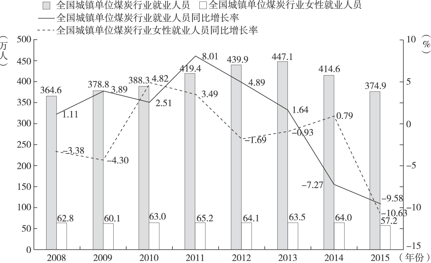 據(jù)《中國(guó)勞動(dòng)統(tǒng)計(jì)年鑒》(2016),2015年末,全國(guó)城鎮(zhèn)單位煤炭行業(yè)就業(yè)人員為374.9萬(wàn)人,同比降低9.58%;其中,全國(guó)城鎮(zhèn)單位煤炭行業(yè)女性就業(yè)人員達(dá)到57.2萬(wàn)人,同比降低10.63%。從煤炭行業(yè)就業(yè)人員整體發(fā)展趨勢(shì)來(lái)看,全國(guó)城鎮(zhèn)單位煤炭行業(yè)就業(yè)人員在2013年達(dá)到峰值447.1萬(wàn)人,近幾年逐年下降,同時(shí),煤炭行業(yè)就業(yè)人員同比增長(zhǎng)率從2012年開(kāi)始逐年下降,2014年開(kāi)始進(jìn)入負(fù)增長(zhǎng)狀態(tài)(如圖8-2所示)。