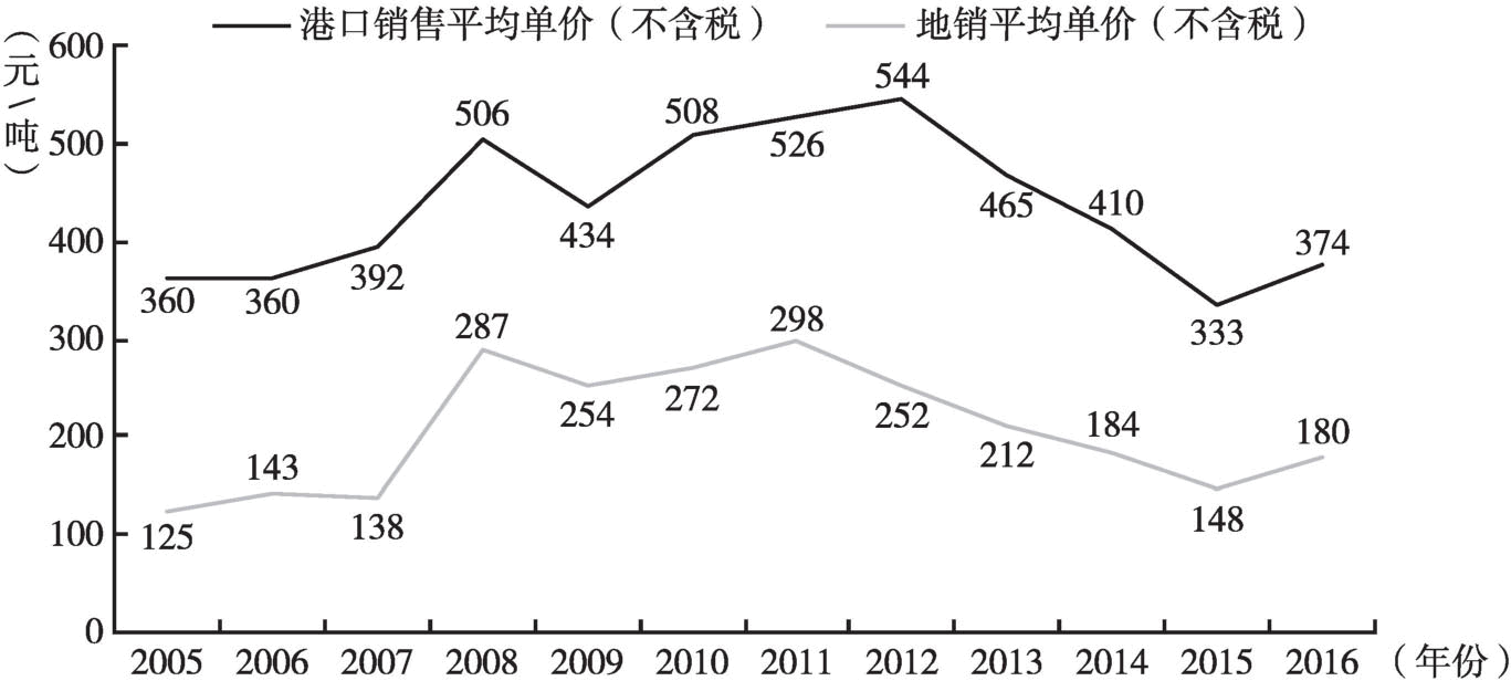 圖1 伊泰集團(tuán)2005~2016年煤炭銷(xiāo)售價(jià)格變化
