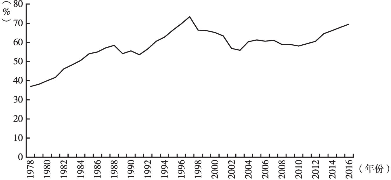 (2)企業(yè)性質(zhì)。在我國,國有企業(yè)相對于民營企業(yè),負(fù)債動機比較強烈,負(fù)債水平一般較高,因此杠桿率通常較高。2016年末我國國有企業(yè)負(fù)債占非金融企業(yè)整體負(fù)債的比例接近70%,國有企業(yè)杠桿率明顯高于其他類型企業(yè),以規(guī)模以上工業(yè)企業(yè)為例,國有企業(yè)資產(chǎn)負(fù)債率達(dá)66.1%,而同期全部規(guī)模以上工業(yè)企業(yè)資產(chǎn)負(fù)債率為55.8%[20]。例如,我國煤炭企業(yè)中的骨干企業(yè),絕大部分是具有相當(dāng)規(guī)模的大型國有或國有控股企業(yè),具有使用高杠桿獲得更大發(fā)展的動能,并具有獲得債務(wù)融資的體制優(yōu)勢,資產(chǎn)負(fù)債率通常相對比較高。