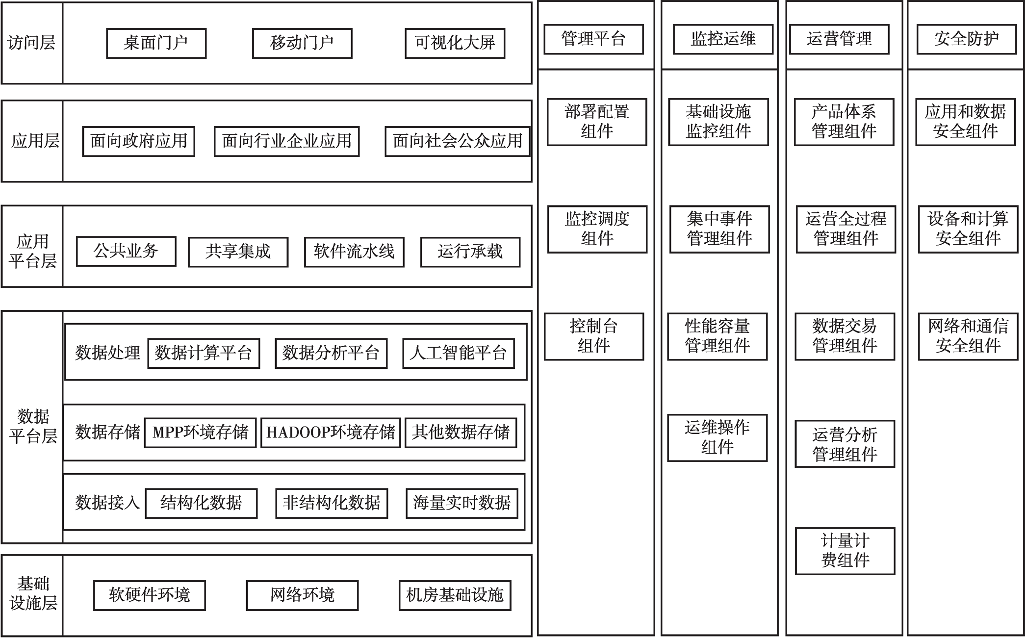 基礎(chǔ)設(shè)施層包括數(shù)據(jù)存儲、計算、分析應(yīng)用的軟硬件環(huán)境、網(wǎng)絡(luò)環(huán)境,以及配套的機(jī)房基礎(chǔ)設(shè)施;數(shù)據(jù)平臺層包括數(shù)據(jù)接入、數(shù)據(jù)倉庫、大數(shù)據(jù)平臺存儲計算組件、區(qū)塊鏈和數(shù)據(jù)集市;應(yīng)用平臺層包括公共業(yè)務(wù)、共享集成、軟件流水線和運行承載所需的各類組件;應(yīng)用層即圍繞需求開發(fā)的各類信息化系統(tǒng),包括面向政府、面向企業(yè)、面向公眾三類;訪問層通過應(yīng)用訪問、應(yīng)用發(fā)布門戶為使用者提供訪問接入和應(yīng)用展現(xiàn)。