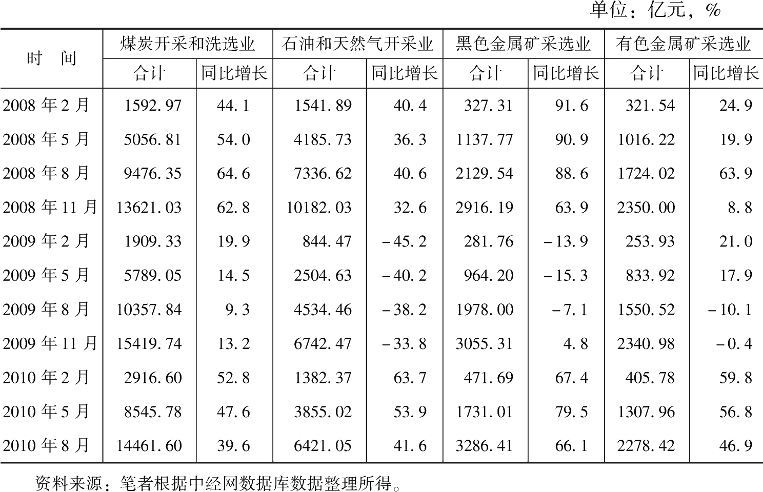 表4-6 2008年以來我國采掘業(yè)各子行業(yè)主營業(yè)務(wù)收入及其累計增速