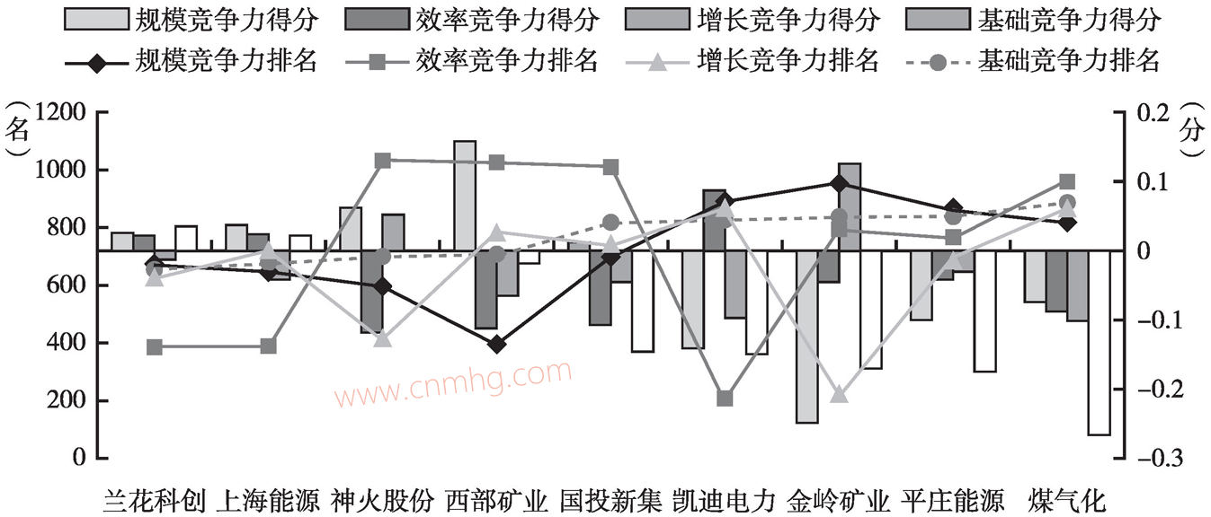具體來看,金嶺礦業(yè)、平莊能源和煤氣化的規(guī)模競爭力、效率競爭力和增長競爭力得分都為負(fù)數(shù),都遠(yuǎn)低于全行業(yè)平均水平,導(dǎo)致這3家企業(yè)的基礎(chǔ)競爭力也均為負(fù)值,排名相對靠后,基礎(chǔ)競爭力排名分別為第824、第836和第841位。西部礦業(yè)、國投新集和凱迪電力則均有兩項(xiàng)競爭力得分為負(fù),其中,西部礦業(yè)和國投新集的效率競爭力和增長競爭力得分為負(fù),而凱迪電力則是規(guī)模競爭力和增長競爭力得分為負(fù)。蘭花科創(chuàng)、上海能源和神火股份則均有一項(xiàng)競爭力得分為負(fù)??傮w而言,本組企業(yè)的規(guī)模競爭力較效率競爭力和增長競爭力強(qiáng),規(guī)模優(yōu)勢比較突出,但受制于企業(yè)運(yùn)營效率和成長能力的制約,企業(yè)基礎(chǔ)競爭力整體仍比較弱。