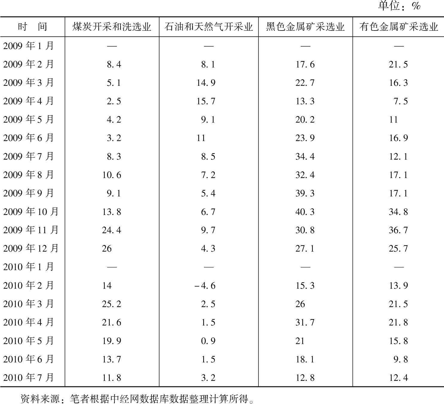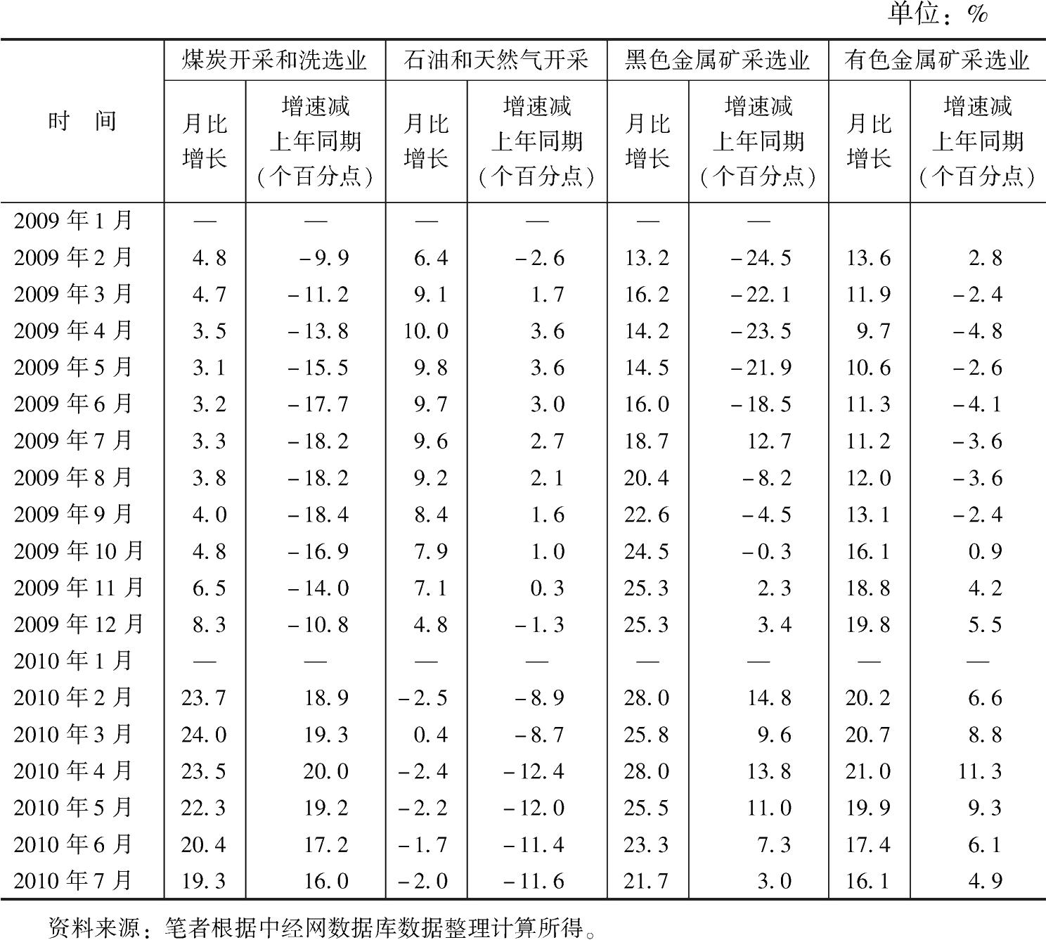 2009年以來,我國采掘業(yè)規(guī)模進(jìn)一步擴(kuò)大。從采掘業(yè)各行業(yè)月度工業(yè)增加值增速來看,煤炭開采和洗選業(yè)工業(yè)增加值月度增速穩(wěn)步提高;黑色金屬礦采選業(yè)與有色金屬礦采選業(yè)工業(yè)增加值增速保持在比較高的水平,但波動較大。石油和天然氣開采業(yè)工業(yè)增加值月度增速較慢,部分月份出現(xiàn)負(fù)增長(見表4-1)。從采掘業(yè)各行業(yè)工業(yè)增加值累計增長速度來看,2009年,煤炭開采和洗選業(yè)、石油和天然氣開采業(yè)、黑色金屬礦采選業(yè)與有色金屬礦采選業(yè)工業(yè)增加值增速同比分別為8.3%、4.8%、25.3%和19.8%,其中,煤炭開采和洗選業(yè)和石油和天然氣開采業(yè)增速較上年同期增速分別減緩10.8和1.3個百分點(diǎn);黑色金屬礦采選業(yè)與有色金屬礦采選業(yè)工業(yè)增加值增速則分別提高了3.4和5.5個百分點(diǎn)(見表4-2)。2010年1~7月,除了石油和天然氣采選業(yè)工業(yè)增加值出現(xiàn)負(fù)增長及增幅減緩?fù)猓禾块_采和洗選業(yè)、黑色金屬礦采選業(yè)與有色金屬礦采選業(yè)各月累計工業(yè)增加值迅速增加,增幅較上年同期均有所提高。
