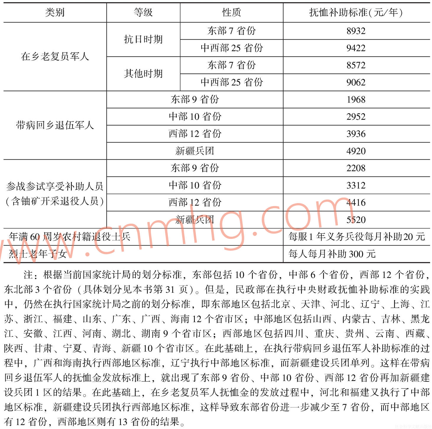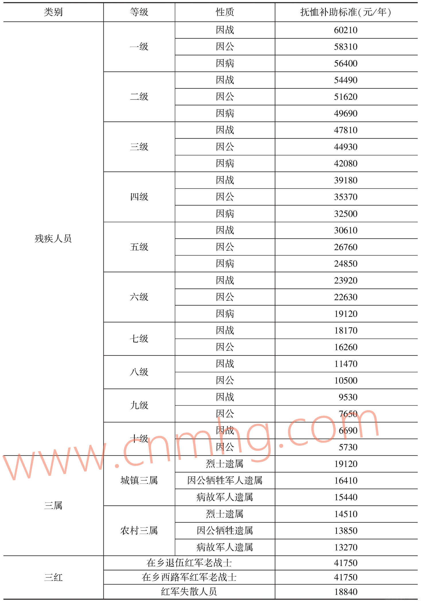 為進(jìn)一步提高優(yōu)撫對象生活保障水平,按照自然增長機(jī)制要求,民政部、財(cái)政部從2015年10月1日起再次大幅提高部分優(yōu)撫對象等人員撫恤和生活補(bǔ)助標(biāo)準(zhǔn)。傷殘人員殘疾撫恤金標(biāo)準(zhǔn)、城鎮(zhèn)“三屬”定期撫恤金標(biāo)準(zhǔn)、“三紅”生活補(bǔ)助標(biāo)準(zhǔn)提高15%,農(nóng)村“三屬”定期撫恤金標(biāo)準(zhǔn)提高30%,在鄉(xiāng)老復(fù)員軍人中央財(cái)政補(bǔ)助標(biāo)準(zhǔn)每人每年提高2400元,烈士老年子女中央財(cái)政補(bǔ)助標(biāo)準(zhǔn)每人每年提高1200元,帶病回鄉(xiāng)退伍軍人補(bǔ)助標(biāo)準(zhǔn)每人每月提高50元、參戰(zhàn)參試人員補(bǔ)助標(biāo)準(zhǔn)每人每月提高100元,農(nóng)村籍老義務(wù)兵每服一年義務(wù)兵役每月增加補(bǔ)助5元。各類優(yōu)撫對象平均提標(biāo)幅度達(dá)20%以上。這是自改革開放以來,國家第22次提高傷殘人員殘疾撫恤金標(biāo)準(zhǔn),第25次提高“三屬”定期撫恤金標(biāo)準(zhǔn)和“三紅”生活補(bǔ)助標(biāo)準(zhǔn),也是近年來優(yōu)撫對象提標(biāo)幅度最大的一次。這對于保障優(yōu)撫對象與廣大人民群眾一道奔小康、共享經(jīng)濟(jì)社會(huì)發(fā)展成果具有重要意義。優(yōu)撫對象中央財(cái)政撫恤補(bǔ)助標(biāo)準(zhǔn)具體見表10-1。