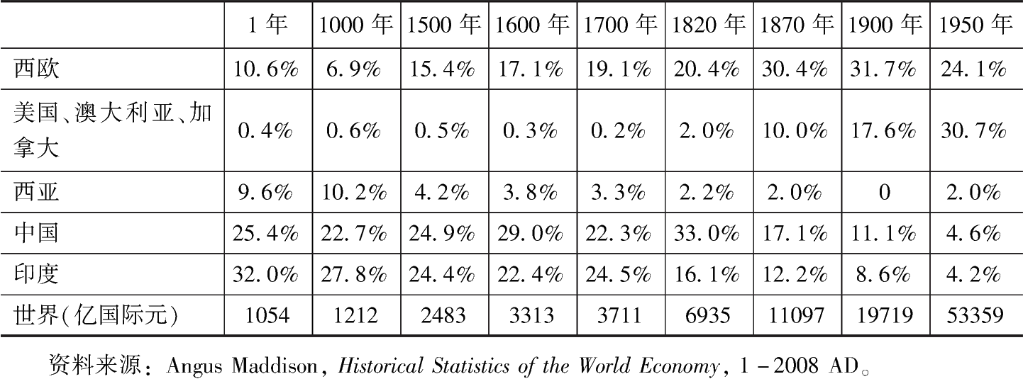 自英國(guó)工業(yè)革命以來(lái),世界經(jīng)濟(jì)邁入了現(xiàn)代經(jīng)濟(jì)增長(zhǎng)時(shí)代。這個(gè)時(shí)代一個(gè)突出的表現(xiàn)是經(jīng)濟(jì)持續(xù)增長(zhǎng),由此帶來(lái)全球經(jīng)濟(jì)規(guī)??焖僭龃?。這是與以往的農(nóng)業(yè)時(shí)代很不同的現(xiàn)象。按照英國(guó)著名經(jīng)濟(jì)學(xué)家安格斯·麥迪森(Angus Maddison)的統(tǒng)計(jì),如表5-1所示,公元1年時(shí),人類(lèi)經(jīng)濟(jì)總量為1000多億國(guó)際元(這是按照1990年國(guó)際購(gòu)買(mǎi)力核定的一個(gè)財(cái)富度量單位),公元1000年時(shí),人類(lèi)經(jīng)濟(jì)總量為1200多億國(guó)際元。也就是說(shuō),在1000年的時(shí)間里,人類(lèi)經(jīng)濟(jì)總量增長(zhǎng)了不到15%,年均增速幾乎為零。到1500年,這一規(guī)模擴(kuò)大至約2500億國(guó)際元,人類(lèi)社會(huì)將經(jīng)濟(jì)總量翻一番花費(fèi)了500年的時(shí)間。但在接下的發(fā)展歷程中,人類(lèi)經(jīng)濟(jì)總量再度實(shí)現(xiàn)翻一番的時(shí)間只用了不到300年。1820年,人類(lèi)經(jīng)濟(jì)總量已經(jīng)接近7000億國(guó)際元。再過(guò)50年,人類(lèi)經(jīng)濟(jì)總量已經(jīng)增長(zhǎng)至約11100億國(guó)際元。進(jìn)入20世紀(jì)后,人類(lèi)繼續(xù)行走在經(jīng)濟(jì)持續(xù)增長(zhǎng)的軌道上。人類(lèi)經(jīng)濟(jì)總量到1900年時(shí)接近2萬(wàn)億國(guó)際元,1950年則發(fā)展到5.3萬(wàn)多億國(guó)際元。從1820年到1950年的130年里,人類(lèi)經(jīng)濟(jì)總量增長(zhǎng)了6倍多。自1820年以來(lái)的時(shí)代是一個(gè)經(jīng)濟(jì)高速增長(zhǎng)的時(shí)代,但經(jīng)濟(jì)增長(zhǎng)主要是由西方世界實(shí)現(xiàn)的。西歐加上美國(guó)、加拿大、澳大利亞等國(guó)家和地區(qū)占世界經(jīng)濟(jì)的比重從1820年的22.4%增長(zhǎng)至1950年的54.8%,而中印所占比重卻從1820年的49.1%下降至1950年的8.8%,這是一次巨大的經(jīng)濟(jì)重心的轉(zhuǎn)移。