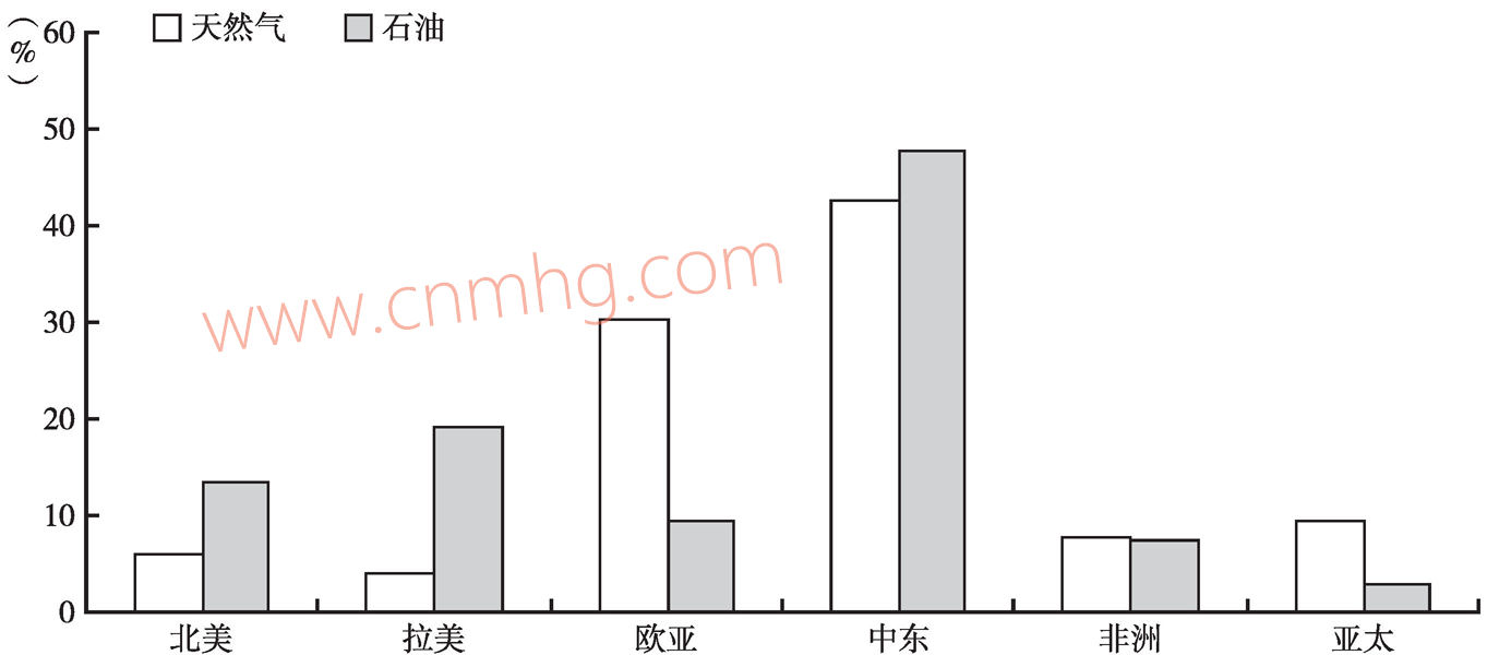 圖5-2 全球主要地區(qū)的天然氣和原油儲(chǔ)量占比