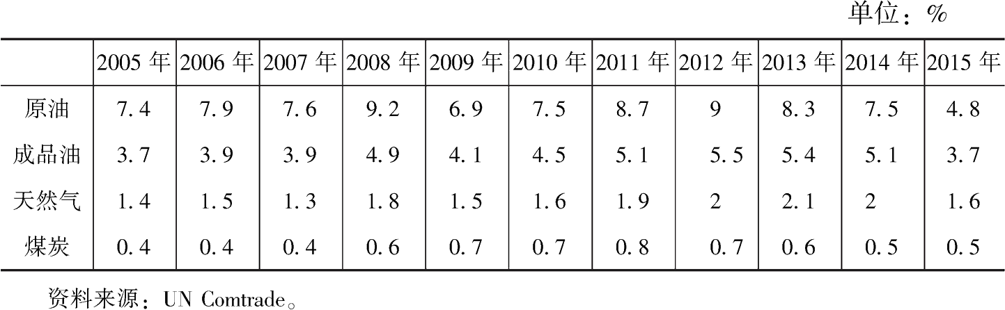 表5-2 礦物燃料類(lèi)貨物出口額在全球貨物出口額中所占的比重