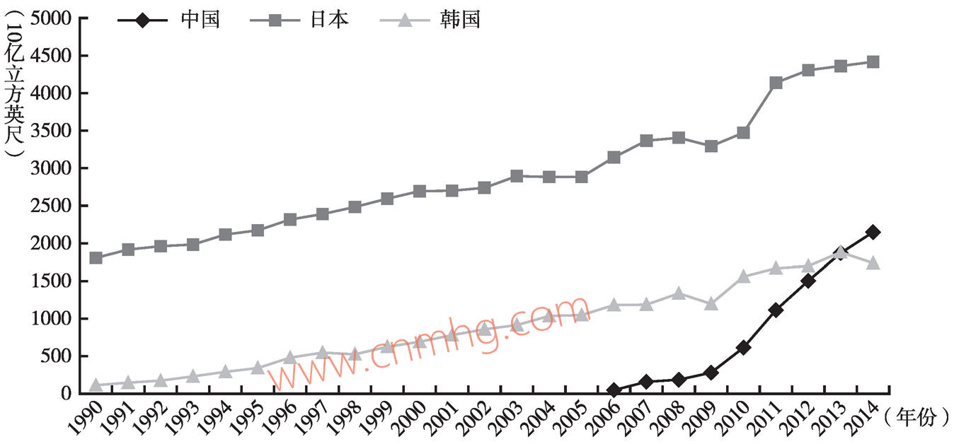 圖5-3 中國(guó)、日本、韓國(guó)的天然氣進(jìn)口量