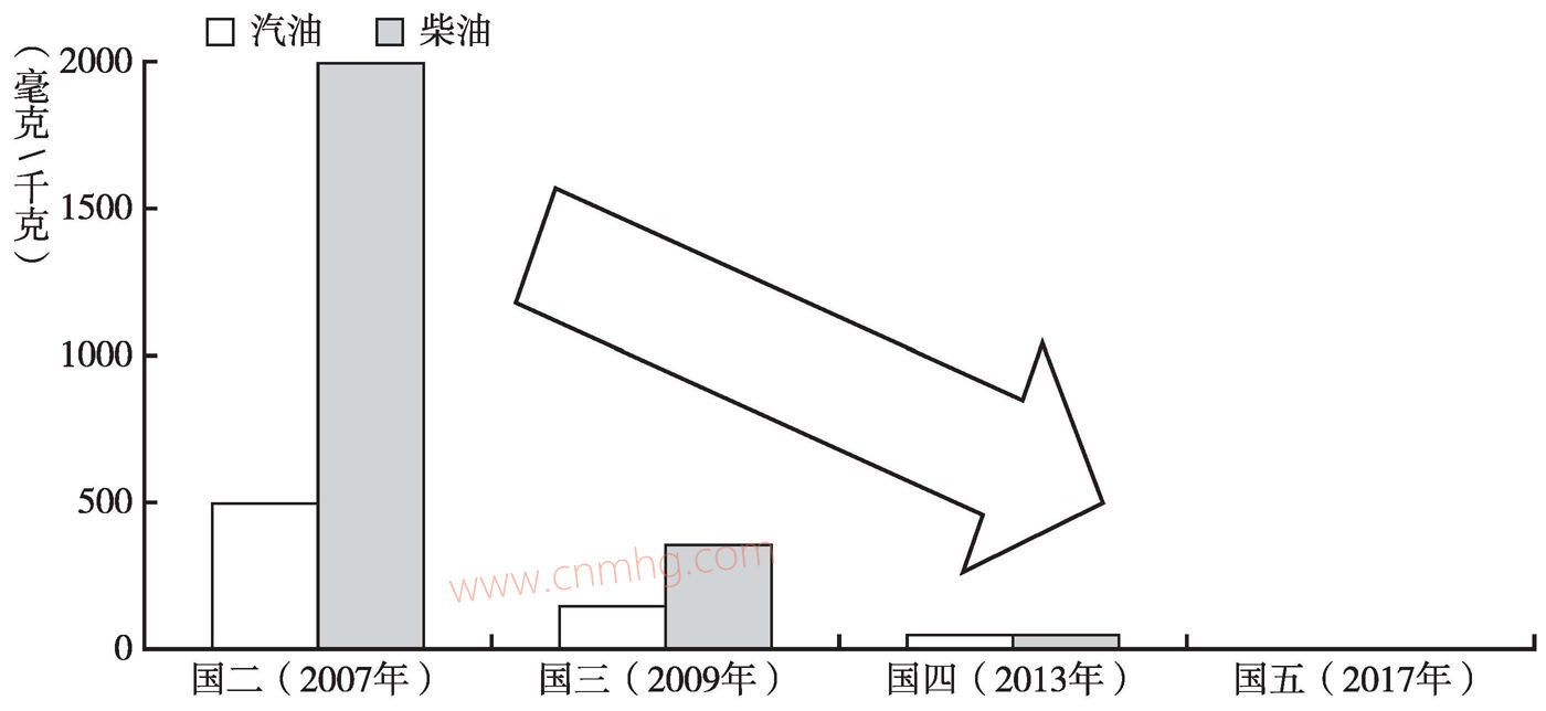 圖1 從國二到國五四個階段的汽柴油硫含量消減示意