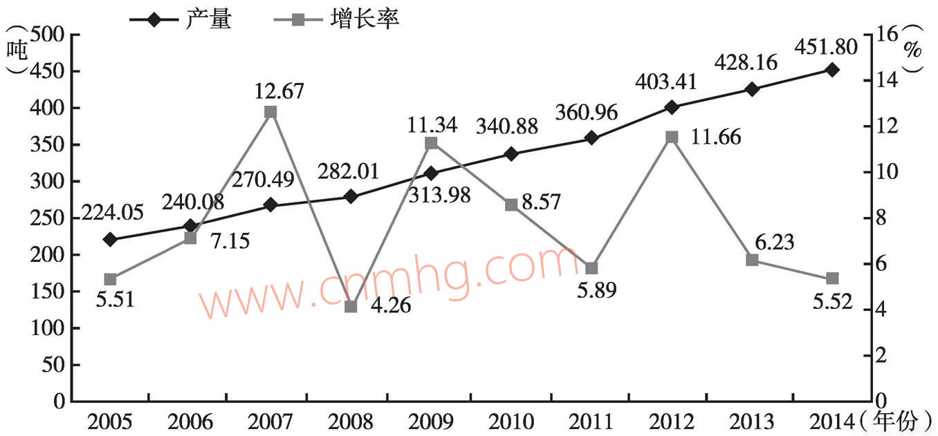 圖3 2005~2014年國(guó)內(nèi)黃金資源產(chǎn)量及增長(zhǎng)率(不包括進(jìn)口資源產(chǎn)量)