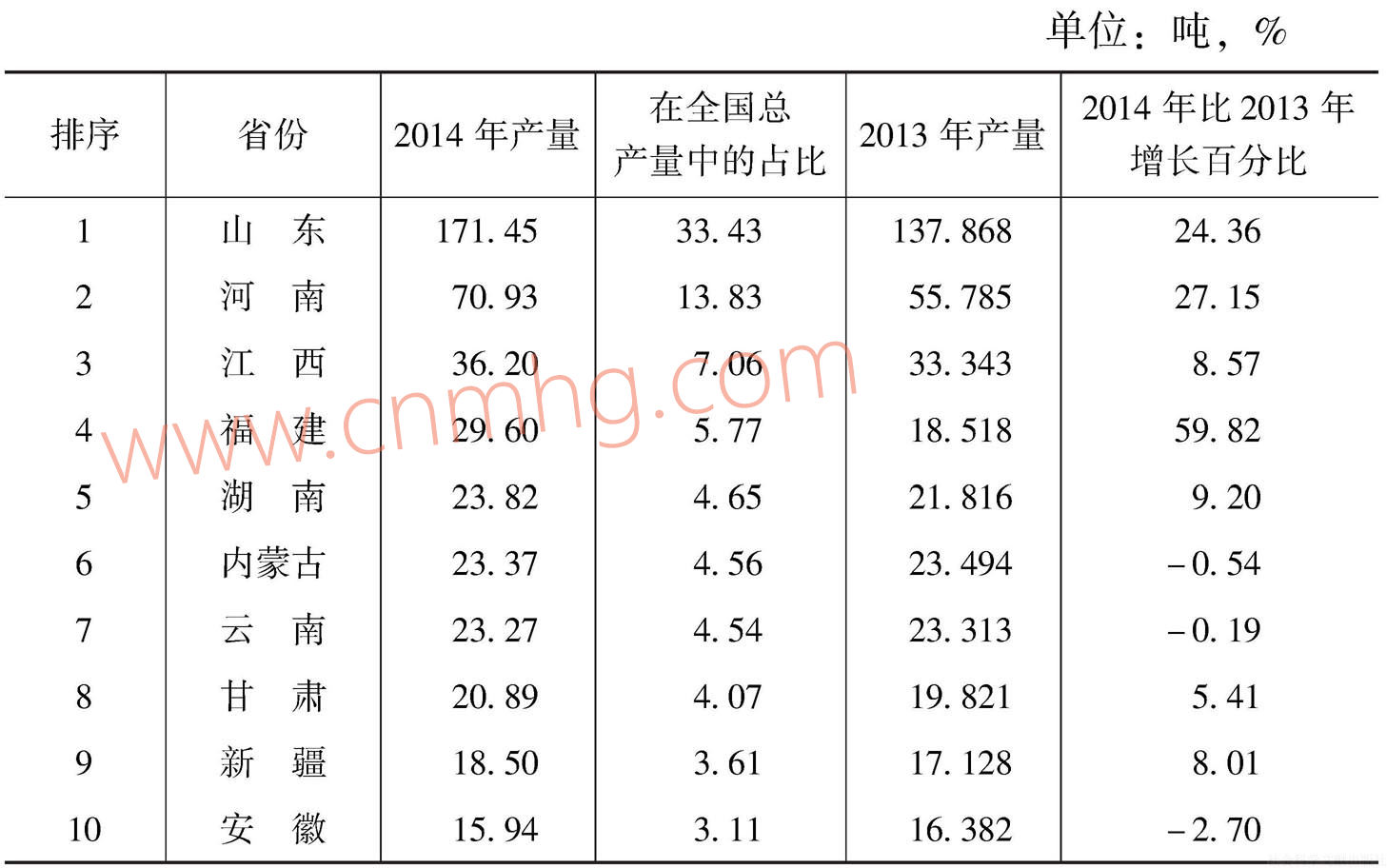 表2 2014年我國(guó)黃金產(chǎn)量前十名省份