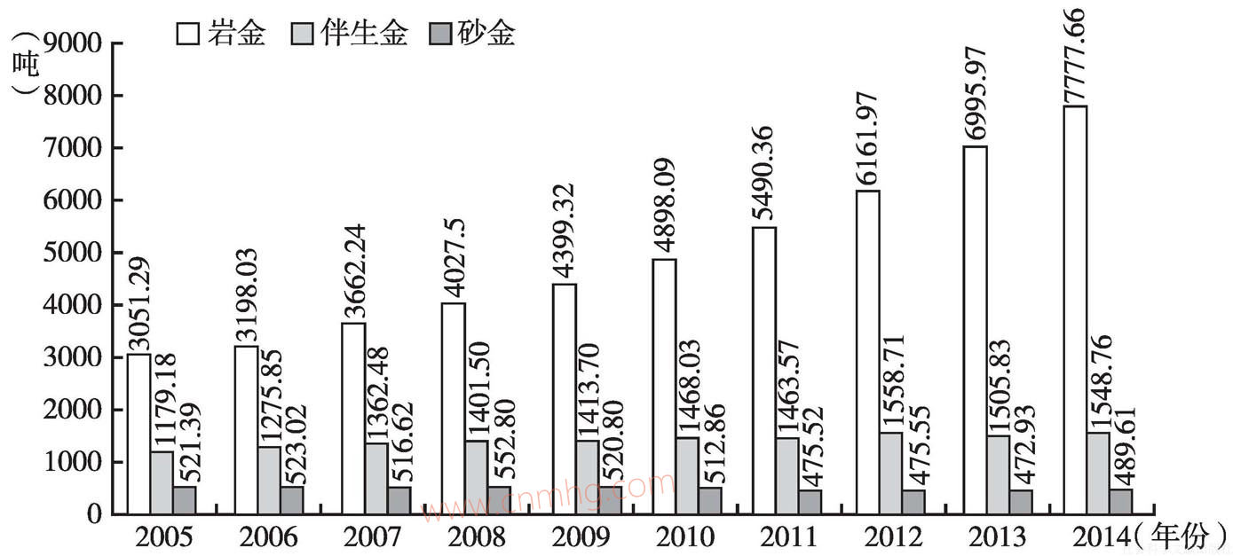 我國(guó)已探明黃金地質(zhì)儲(chǔ)量是以巖金為主,巖金是近十年增加最多的品種,2005~2014年增加了4726.37噸,占比也因此上升了15.02個(gè)百分點(diǎn),由64.21%上升到79.23%;伴生金在2005~2014年增加了369.58噸,增加量大大低于巖金,占比由2005年的24.81%下降到2014年的15.78%;沙金不增反而下降,占比為4.99%,沙金萎縮的趨勢(shì)明顯。
