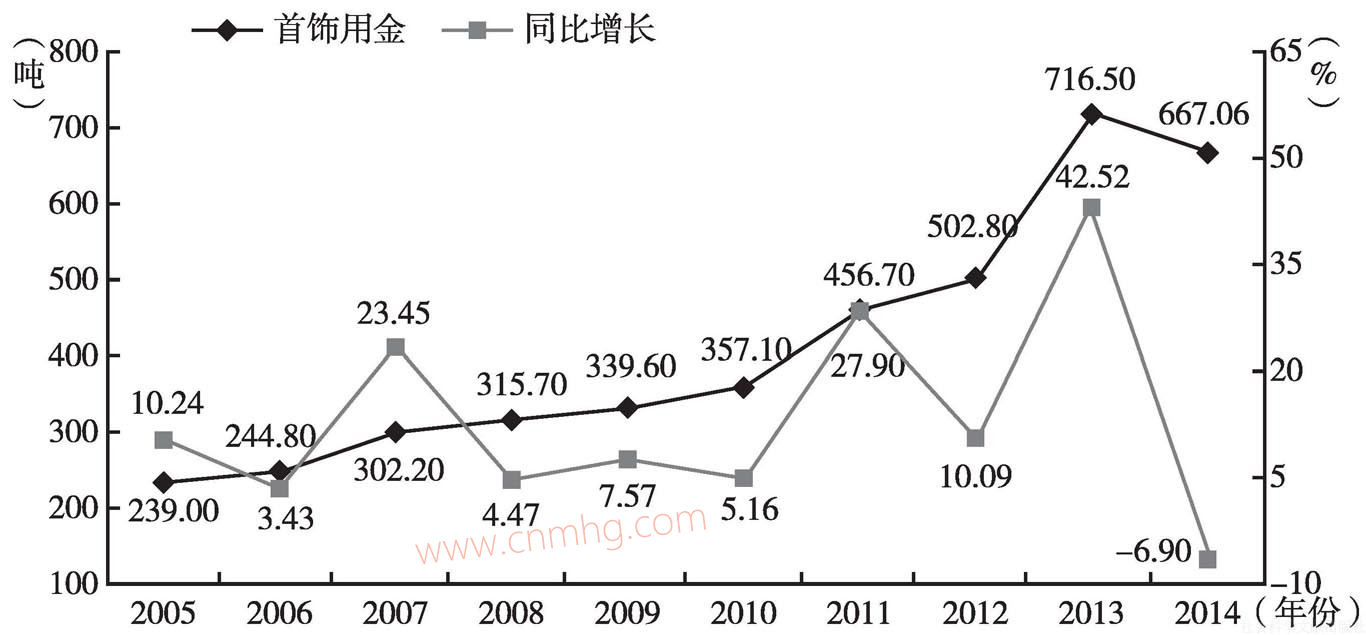圖4 2005~2014年我國(guó)黃金首飾生產(chǎn)用金變化