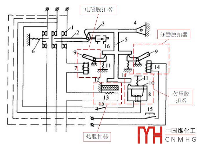 分勵(lì)脫扣器也是常用的脫扣器。按下按鈕15→分勵(lì)脫扣器線圈14通電→吸合銜鐵9→銜鐵9推動(dòng)連桿機(jī)構(gòu)5向上運(yùn)動(dòng)→脫扣機(jī)構(gòu)3與鎖鍵2分開(kāi)→自由脫扣機(jī)構(gòu)動(dòng)作→彈簧6拉動(dòng)主觸頭斷開(kāi)→主回路斷電。