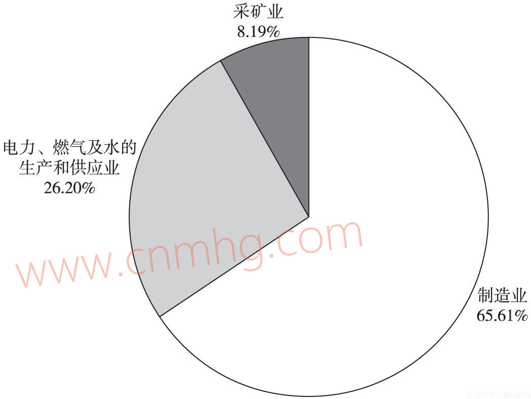 分行業(yè)看,2015年河南制造業(yè)[1]能源消費(fèi)量在第二產(chǎn)業(yè)中占比最高,達(dá)到65.61%;其次為電力、燃?xì)饧八纳a(chǎn)和供應(yīng)業(yè)[2]。2015年,河南分行業(yè)規(guī)模以上工業(yè)企業(yè)能源消費(fèi)比例詳見圖5。
