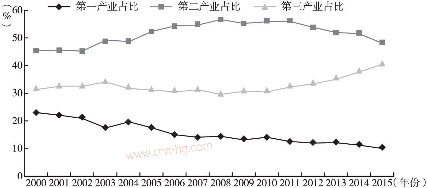 圖2 2000~2015年河南省三次產(chǎn)業(yè)結(jié)構(gòu)變化