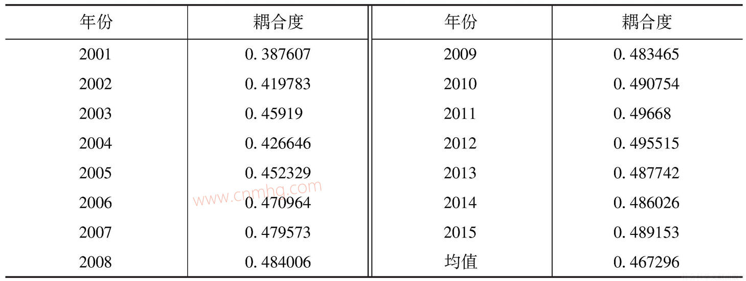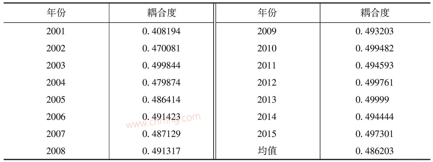 2001~2015年河南省能源體系和產(chǎn)業(yè)體系之間的耦合度詳見表3。
