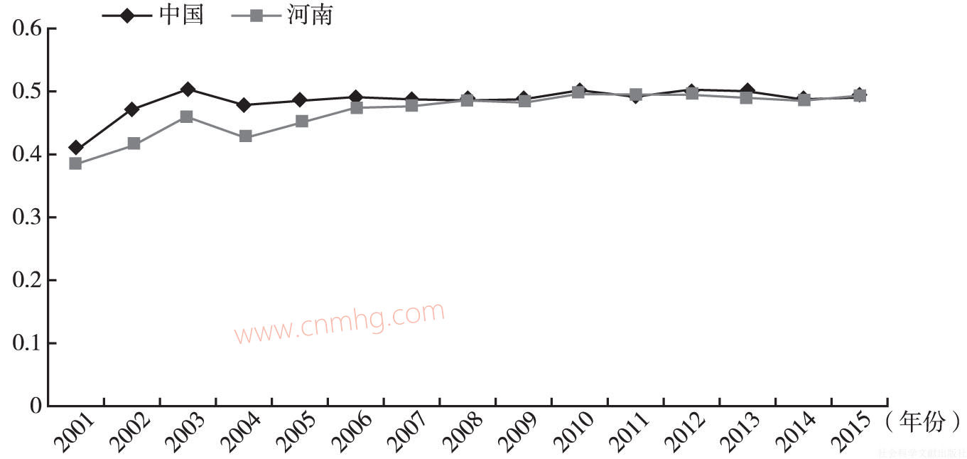 河南能源體系與產(chǎn)業(yè)體系的耦合度偏低,但總體呈上升的態(tài)勢(shì)。2001~2015年,河南省能源體系和產(chǎn)業(yè)體系的整體耦合度始終低于0.50,河南能源體系和產(chǎn)業(yè)體系處于低度耦合的狀態(tài)。從發(fā)展趨勢(shì)看,河南省能源體系和產(chǎn)業(yè)體系的耦合度在不斷上升。2001~2005年,全省能源體系和產(chǎn)業(yè)體系耦合度在0.47以下;2006~2010年,耦合度上升至0.47以上;“十二五”以來,全省能源體系和產(chǎn)業(yè)體系耦合度總體呈現(xiàn)波動(dòng)上升的態(tài)勢(shì),2015年達(dá)到0.49。與全國對(duì)比來看,河南省的能源體系和產(chǎn)業(yè)體系的耦合程度比全國低4個(gè)百分點(diǎn),但差距逐步收窄。