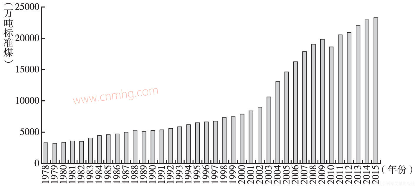 改革開放以來,河南的能源消費(fèi)持續(xù)增長。1978年河南省的能源消費(fèi)總量僅為3353萬噸標(biāo)準(zhǔn)煤,2015年達(dá)到23161萬噸標(biāo)準(zhǔn)煤。在近40年的時(shí)間中,河南省能源消費(fèi)年均增長5.4%,比全國平均水平低0.2個(gè)百分點(diǎn),1978~2015年河南能源消費(fèi)總量詳見圖3。