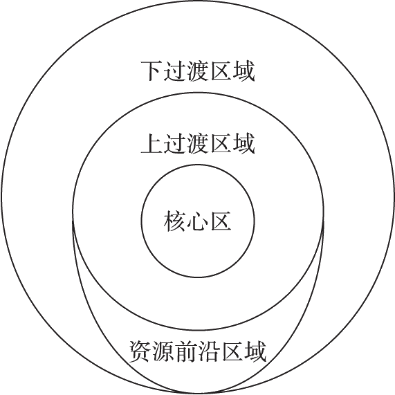 區(qū)域經(jīng)濟學家弗里德曼曾經(jīng)提出了區(qū)域發(fā)展的“核心—外圍”理論,該理論認為經(jīng)濟的發(fā)展在不同的區(qū)域有所不同,經(jīng)濟的發(fā)展不會同時發(fā)生在所有區(qū)域而是會形成一個核心,這個核心區(qū)域一般位于城市繁華地帶,這是因為城市在工業(yè)發(fā)達程度和技術(shù)先進水平方面都存在較大的優(yōu)勢,除此之外,城市或城市集聚區(qū)資本集中、人口密集,經(jīng)濟能夠快速增長。經(jīng)濟發(fā)展比較落后的外圍區(qū)域被分為資源前沿區(qū)域和過渡區(qū)域,而過渡區(qū)域由兩部分組成,分別是上過渡區(qū)域和下過渡區(qū)域。由于含有豐富的待開發(fā)資源,資源前沿區(qū)域?qū)^(qū)域經(jīng)濟的發(fā)展具有極大的潛在價值,一般位于兩種過渡區(qū)域之間,如圖2-3所示。