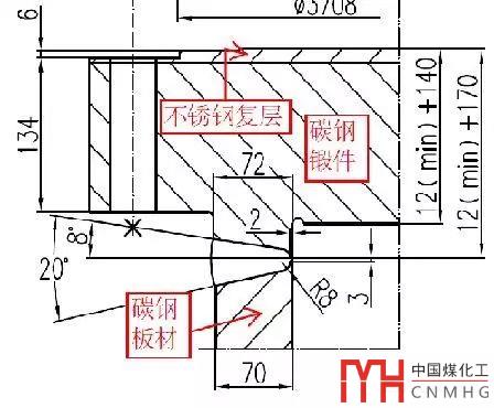 筒體是碳鋼板材,管板是碳鋼鍛件+不銹鋼復(fù)層。由于板材的許用應(yīng)力較高,鍛件許用應(yīng)力較低,其凸肩直邊段按照筒體計算公式會比筒體要厚。所以設(shè)計時將凸肩的厚度增厚了。
