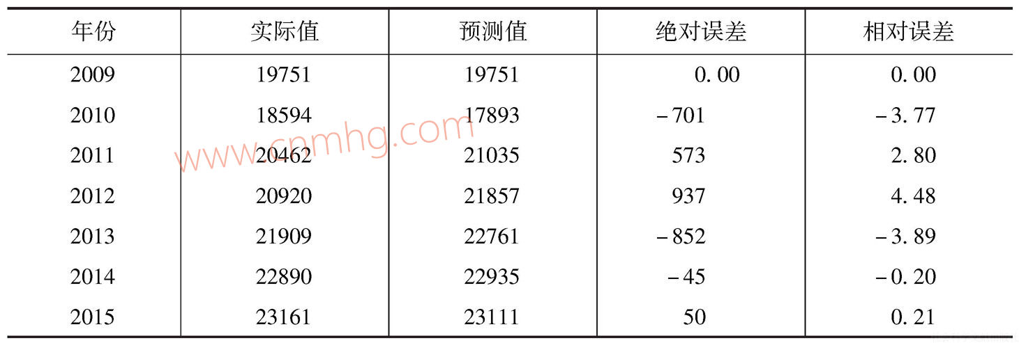 利用該模型,筆者對(duì)2009~2015年河南省的歷史數(shù)據(jù)進(jìn)行校驗(yàn),驗(yàn)證模型的正確性,并對(duì)模型相關(guān)參數(shù)進(jìn)行調(diào)整,確保預(yù)測(cè)偏差在允許范圍內(nèi)。經(jīng)驗(yàn)證,河南能源需求預(yù)測(cè)模型的平均精度為97%,符合灰色系統(tǒng)理論評(píng)測(cè)模型精度的要求。