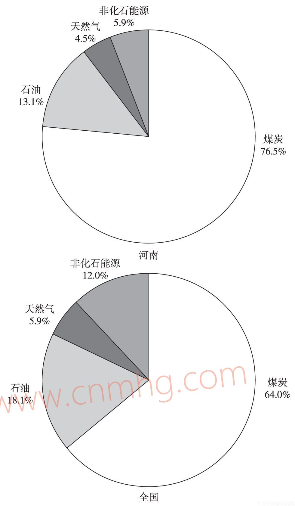 圖2 2015年河南省與全國(guó)一次能源消費(fèi)結(jié)構(gòu)對(duì)比