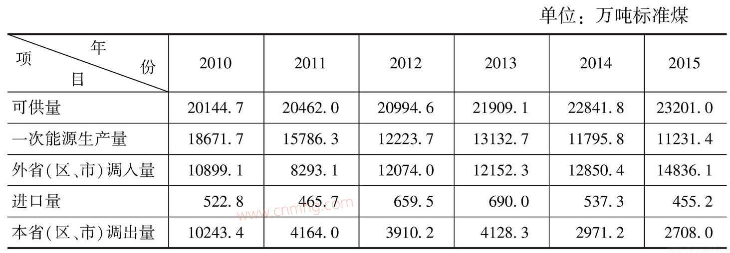 “十二五”期間,2010年河南一次能源供給缺口僅為1156萬噸標(biāo)準(zhǔn)煤,2015年擴(kuò)大到11969萬噸標(biāo)準(zhǔn)煤;從省外凈調(diào)入能源不斷增加,2010年為10899.1萬噸標(biāo)準(zhǔn)煤,2015年增加到14836.1萬噸標(biāo)準(zhǔn)煤(見表3)。河南能源對(duì)外依存度不斷上升,由2010年的6.2%上升到2015年的51.5%。2016年河南能源消費(fèi)總量達(dá)2.38億噸標(biāo)準(zhǔn)煤,同比增長(zhǎng)2.8%;全社會(huì)用電量達(dá)到2980億千瓦時(shí),同比增長(zhǎng)3.8%。能源供需缺口1.28億噸標(biāo)準(zhǔn)煤,能源對(duì)外依存度為53.8%。