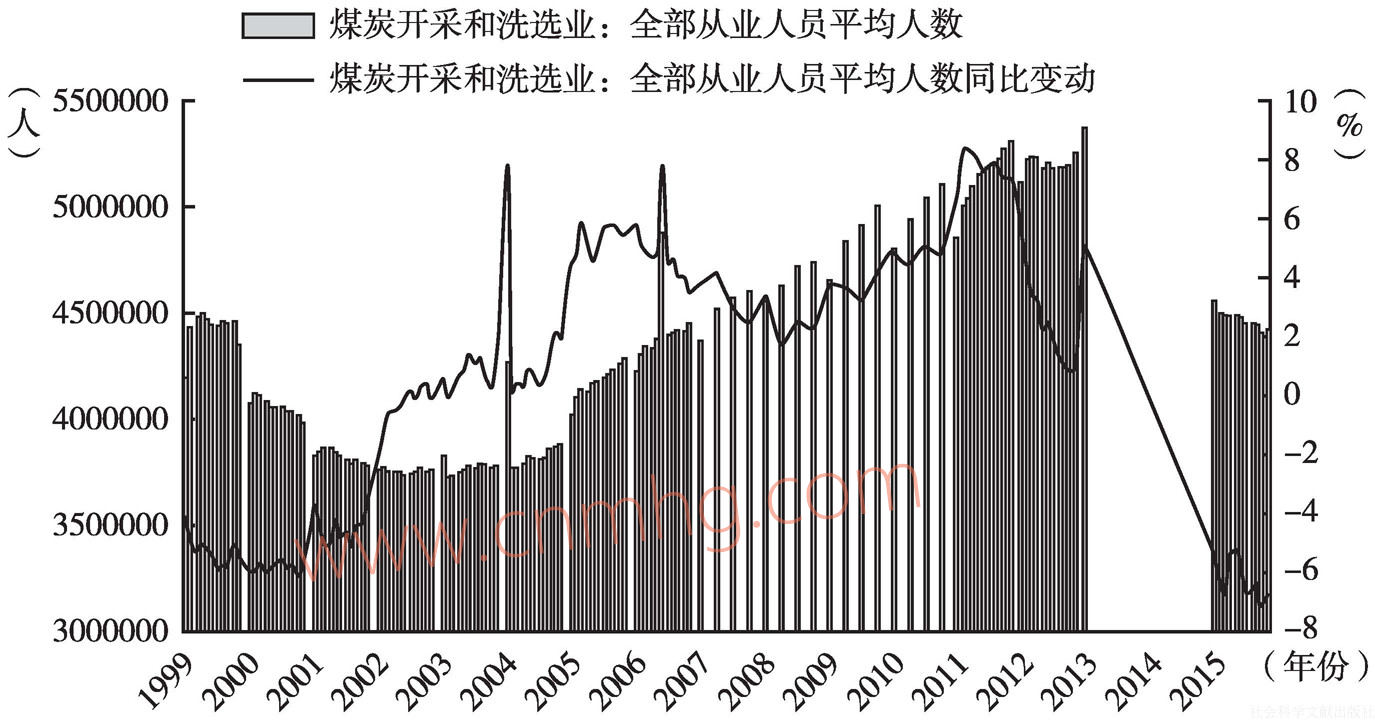 從圖23可以看出,2015年1~12月,中國煤炭開采和洗選業(yè)全部從業(yè)人員平均人數(shù)為442.40萬人,同比增長-6.70%,中國煤炭產(chǎn)量為37.50億噸,人均煤炭年產(chǎn)量約為847.65噸。與1999年12月的情況非常類似,全部從業(yè)人員平均人數(shù)為435.32萬人,同比增長-5.46%,中國煤炭產(chǎn)量為13.64億噸,人均煤炭年產(chǎn)量約為313.33噸。之后,從業(yè)人員平均人數(shù)逐漸下滑至2003年3月的373.02萬人左右。隨著中國煤炭行業(yè)“大牛市”正式啟動,中國煤炭開采和洗選業(yè)全部從業(yè)人員平均人數(shù)一直增加,最高達到2013年的537.05萬人(2013年其他月份和2014年全年月度數(shù)據(jù)缺失),較2013年低點增加了164.03萬人,增長幅度達到43.97%。