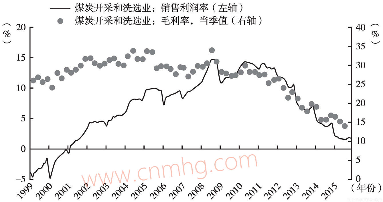 2015年,中國煤炭開采和洗選業(yè)毛利率及銷售利潤率兩個盈利指標延續(xù)了自2011年以來的下滑勢頭。Wind資訊的數(shù)據(jù)顯示,近五年來中國煤炭行業(yè)毛利率水平已經(jīng)下降至15%以下(25.40%→21.57%→18.01%→15.77%→14.19%),創(chuàng)下了自1999年以來的最低水平。此外,國家統(tǒng)計局的數(shù)據(jù)顯示,近五年來中國煤炭行業(yè)銷售利潤率也逐漸下降至2%以下(13.32%→10.62%→7.31%→4.22%→1.76%),全年維持在1.5%~2%(見圖20),正好回到了2001年中國煤炭行業(yè)“大牛市”啟動時的水平。