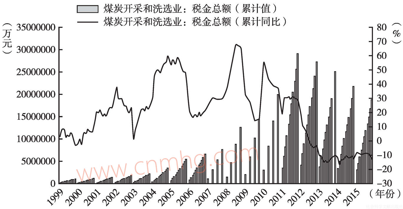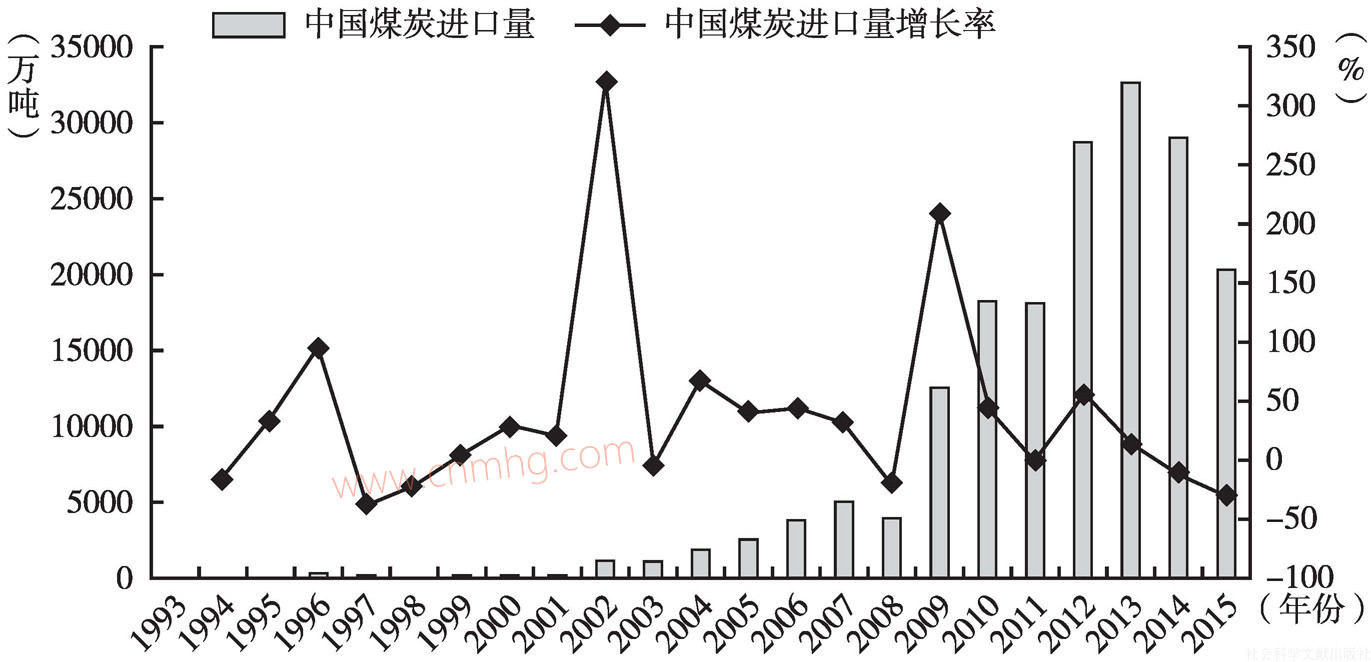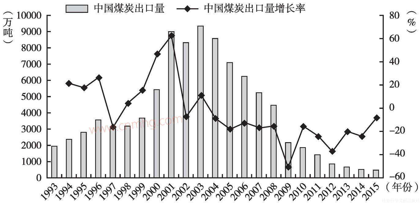 2003年,中國經(jīng)濟開啟了新一輪快速增長期,煤炭行業(yè)也正式拉開了“黃金十年”的序幕,國內(nèi)煤炭需求大增,進而導致了中國煤炭出口政策的關鍵轉(zhuǎn)折點。2003年10月13日,財政部和國家稅務總局發(fā)出《關于調(diào)整出口貨物退稅率的通知》,決定自2004年1月1日起煤炭出口退稅率由13%下調(diào)至11%,另外,焦炭或半焦炭和煉焦煙煤出口退稅率調(diào)低到5%。此后,短短數(shù)年內(nèi),經(jīng)過幾次大的調(diào)整,不但取消了出口退稅政策,而且從2006年11月開始對出口煤炭征收出口暫定關稅一直至今。由此導致2004~2015年中國煤炭出口量一路下滑至今,年平均增長速度為-20.21%。